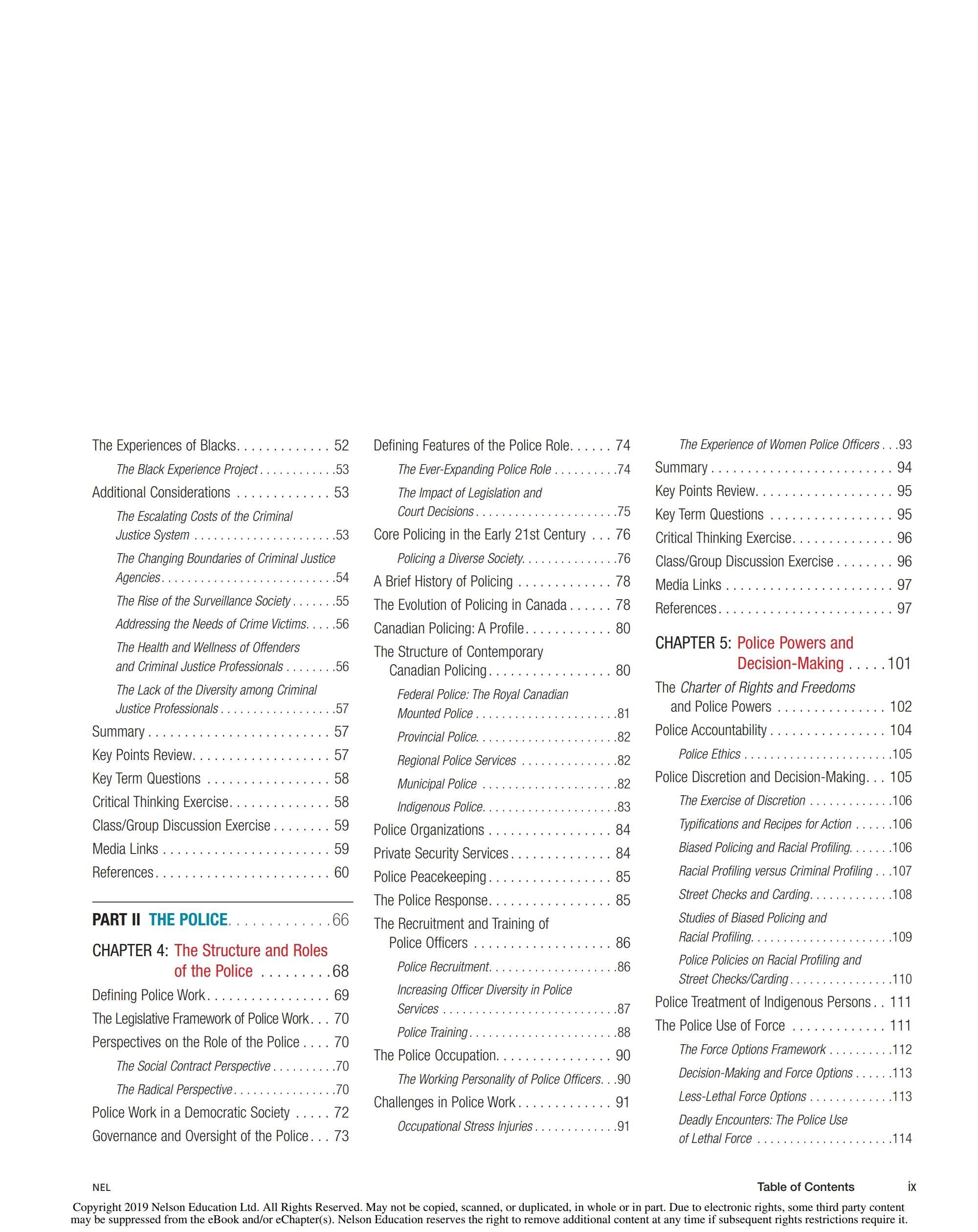 Pa rt II c ontain s tl1r ee c l1apte rs tl1at foc u s 011 vari ou s di1n e 11 sion s of C anadi a 11 p oli c i11g Cl1 a pt e r 4 di sc u sses th e stru c tur e and rol es of th e p oli ce; Cl1 a pt e r 5 exa mi11 es poli ce p owe rs a11d d ec ision-makin g; a11d C h apte r 6 co n sid e rs p o li ce str a t eg ies 7 op e ra tion s7 and e 11gage 1n e nt.