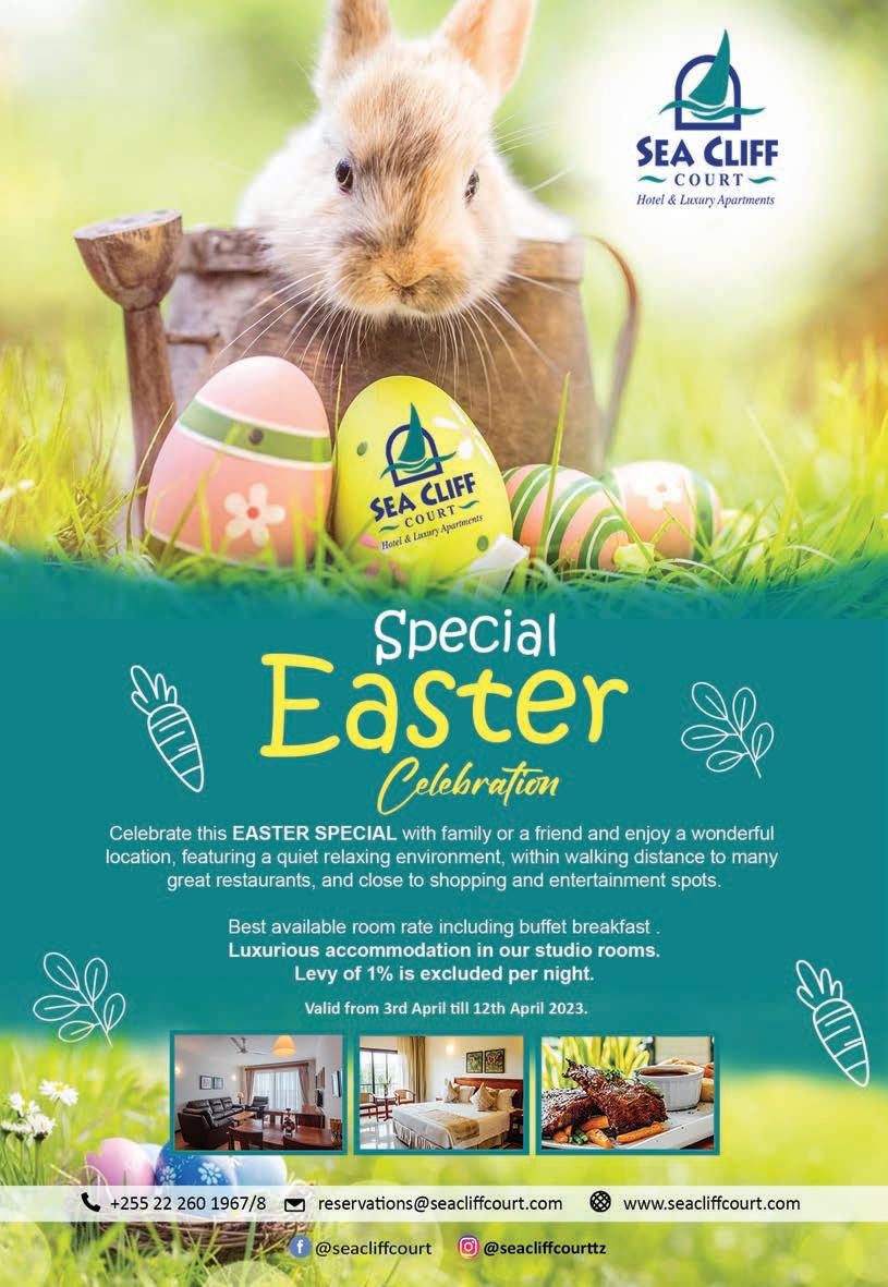 SPECIAL OFFER: USD 220 Per Night | Couple ● Superior Sea View Room ● Breakfast & Dinner ● Kids Stay, Eat & Play Free ● Egg Hunt on Easter Sunday ● 10% Discounts On Spa ● Free Shuttle Bus to the Stone Town Call: 0767 702 241-9 or email: reservations@seacliffzanzibar.com