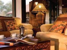 On the other side of the reception lobby is a coffee shop where you can enjoy a wide range of Tanzanian highland brews along with freshly baked pastries. Adjacent to this area, a flight of steps takes you down into the dining room for a leisurely and delicious meal beneath an intricately painted mural on a high gable at one end of the room. Even the floor is a work of art with its multi-coloured timbers and copper nails. Since we love being outdoors, we were thrilled to find out that the restaurant has a terrace running along one side of its entire length so we could enjoy your breakfast with a view over the park’s tree-studded, grassy plains.