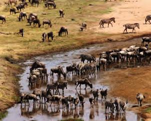 The Tarangire National Park forms part of a bigger wildlife ecosystem covering over 20,000 sq km, which include the Lake Manyara National Park in the north, as well as five other surrounding wildlife-controlled areas. The key to this wildlife ecosystem is the Tarangire River, and the local animal migration in the area begins from this river, at the start of the short rainy season around October every year. At the height of the long rainy season, the animals, which include wildebeest, Thompson gazelles, zebra and even African elephants, will be widely spread out over this 20,000 sq km area. When the wet season ends, the animals begin their migration back towards the river and spend the dry season July to October, concentrated in large numbers around the river.