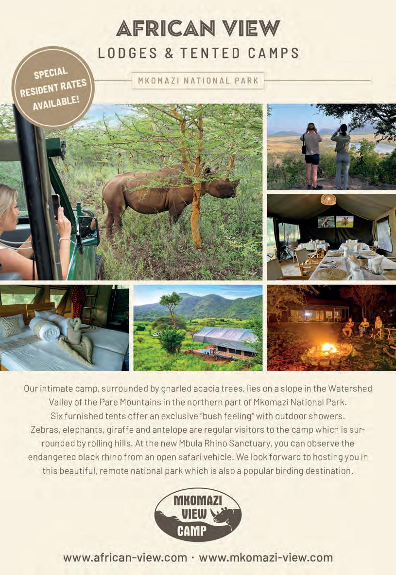 rhino and sociable African wild dog, both of which were successfully reintroduced in the 1990s. Nomadic by nature, wild dogs might be seen almost anywhere in the park, but black rhino are restricted to a fenced sanctuary, ensuring their safe keeping for future generations enjoyment and prosperity.