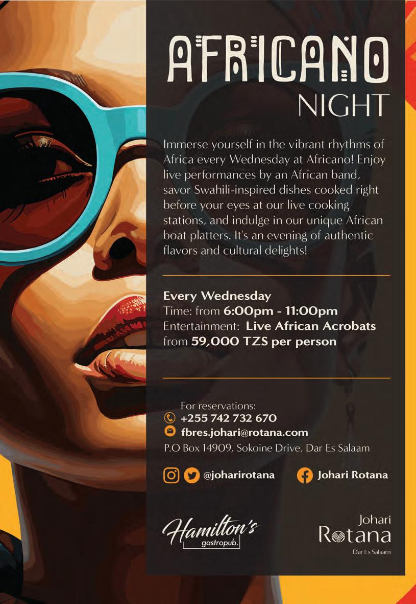 Johari Rotana: Immerse yourself in the vibrant rhythms of Africa at Hamilton's with live acrobat performances, Swahili dishes, live cooking and our unique African boat platter all for TZS59,000 PP. From 6:00pm-11:00pm, call 0742732670.