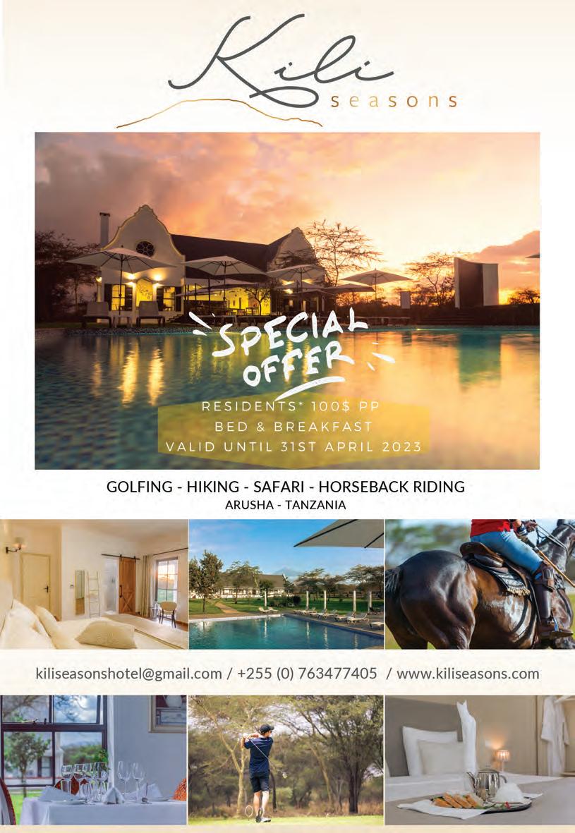 Kili Seasons hotel is located near the number five most beautiful golf courses in Africa. The Golf Club offers spectacular views of Mount Meru and Mount Kilimanjaro, Africa’s highest mountain. Golfing among the zebras and antelopes can rightly be called a “once in a lifetime” experience. The Golf Club is the first 18-hole championship golf course in Tanzania. The presentation of the course is highly unique, with each hole blending effortlessly into the natural canvas of the terrain. Indigenous plants, native grasses and trees add to the individuality of the landscape, providing golfers with a oncein-a-lifetime experience. The greens are large, with subtle changes in elevation as the location demands. Bunkers have been strategically placed to allow golfers a fair route to the fairways and greens. The clubhouse itself sits slightly raised above fairway and green levels. At the nearby driving range, players can enjoy the spectacular view of Mt Kilimanjaro whilst practising their shots.