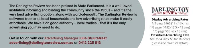 ANNUAL SUBSCRIPTION: You can get a copy of the Review mailed to you if you leave town but want to stay in touch: annual subscription $77 includes mailing within WA. Email: business@darlingtonreview.com.au or phone Betty Pitcher on 0408 912 101 (Publication is printed on PEFC certified 30% recycled paper and uses vegetable inks).