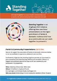 • STANDING TOGETHER, a special Anglicare workshop on Saturday 6 December, @11am. This provides an opportunity to grow awareness and understanding of family and domestic violence and to support conversations around the ways we can participate in its prevention. EVERYONE FROM THE COMMUNITY IS WELCOME