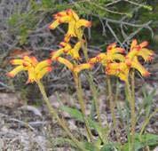 There are red bottle brushes, the less common red grevillea and brown and orange common pea. Scattered over the granite outcrops are many drosera, the beautiful, carnivorous sundew plant.