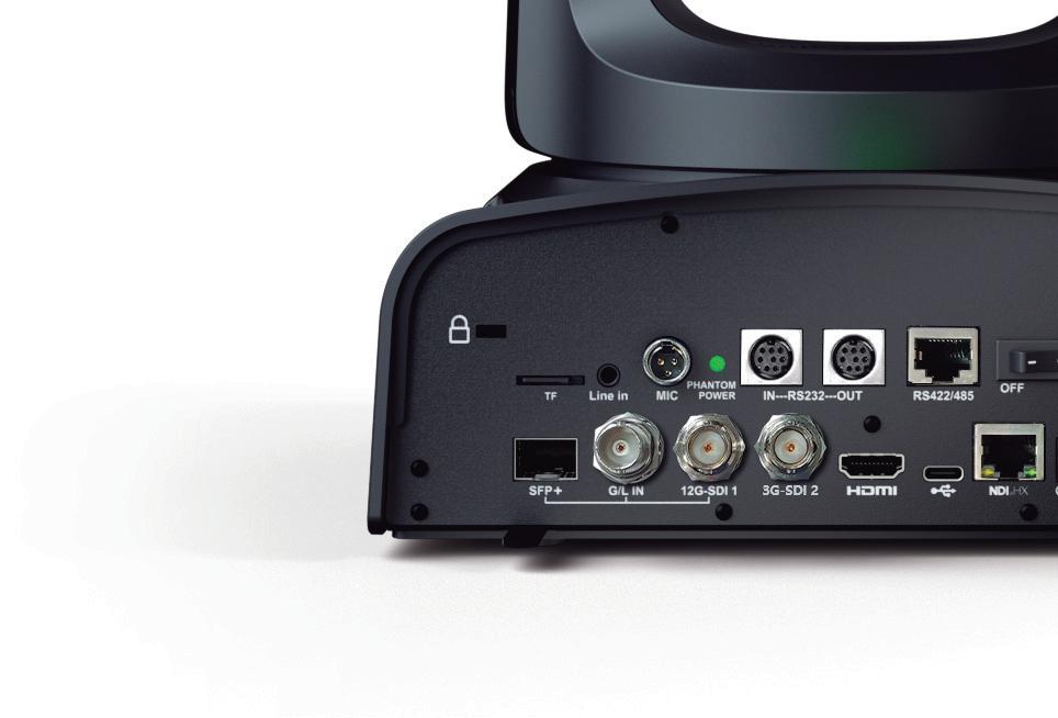 In addition to a rear connection with a multitude of video, audio and communication output to cater to diverse workflows on the professional environment. the im Corre the so scena reality rende the PT PTZ E 12G-S Studio Unrea Mult conn wide interf