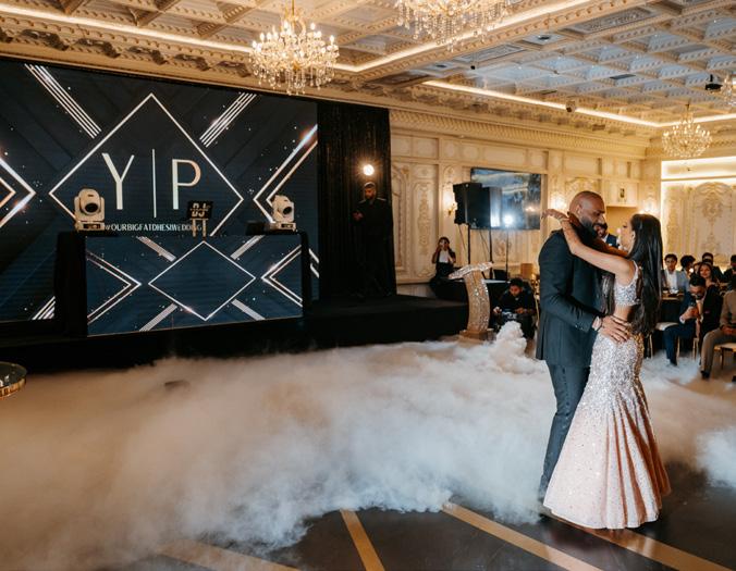 From the beginning, we knew we wanted our reception to be an upscale dance party. Empire Banquet Hall in Calgary, where we had our reception, already has a beautiful Venetian design with gold accent walls. To have it feel like a dance party, we had our production team, House of Bounce, place a large screen on the stage with the DJ booth in front to give the illusion we were at a music festival. It was the first time our parents had gone to the club, if you know what we mean.