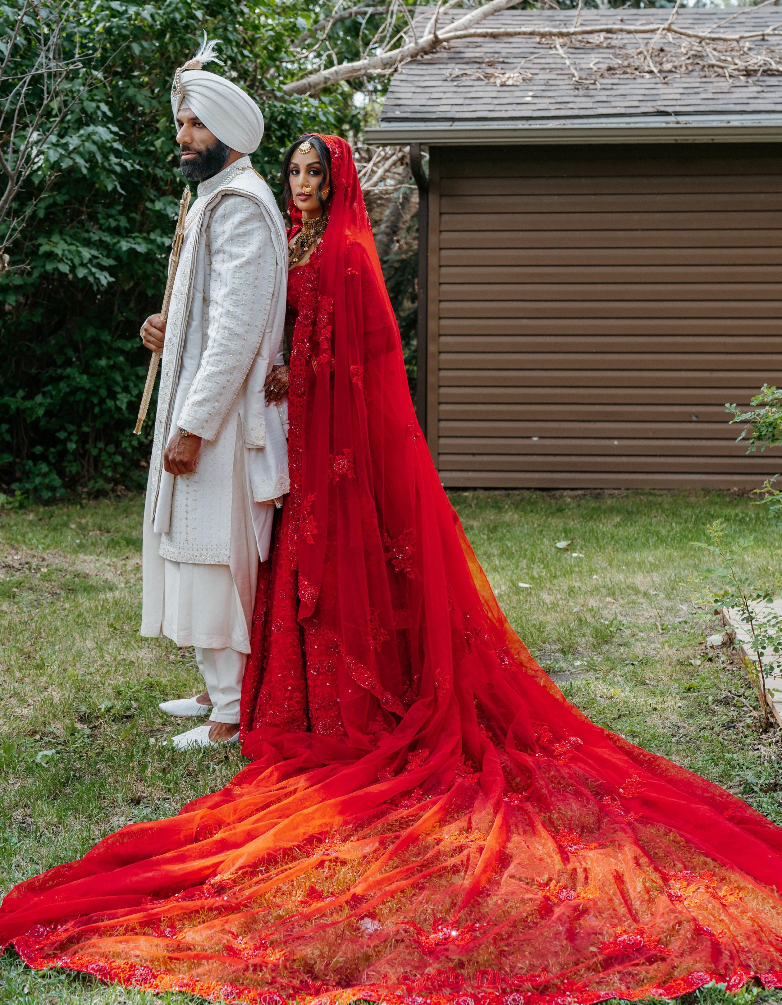 I’ve known for a while that I wanted to wear either a red or ivory monochrome lehenga on my wedding day. For the Anand Karaj, I wore red, and ivory for the Hindu wedding. I got a custom red lehenga with a veil made by Shia from Nazranaa in New Jersey. The veil had Yuvraj Singh Dhesi on it, which was a surprise for Raj. I did some shopping in India, where I found my Hindu wedding lehenga and Garba outfit at Asopalav. Ahmedabad. My original reception outfit was a disaster, so I had to purchase a last-minute outfit from Seema Gujral, which turned out
