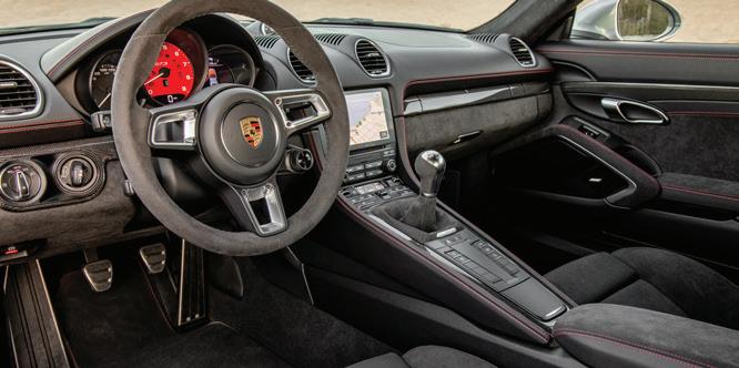 while street driving and all together makes this Cayman a comfortable and capable daily-driver. When the time comes for more spirited operation, the PASM stiffens up and the Porsche Torque Vectoring, working alongside the mechanical limited-slip differential, applies moderate braking to the inside rear wheel helping the coupe get around tight corners quickly and efficiently. For a high-output rear-wheel drive sports car, the ride is remarkably stable. Speaking of the brakes, six-piston calipers clamping onto big 350-millimetre front/330-millimetre rear cross-
