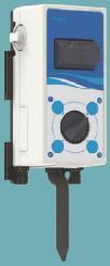 Control functions include an on/off switch, water flow regulation and an eco!mode. A colour-coded LED ring indicates operational status, while a small display shows water volume and