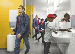 look at how to best equip busy washrooms in stadiums and exhibition halls.