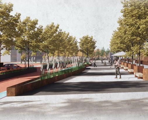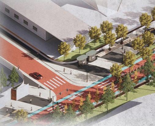 The bustling thoroughfare in the central region of the selected study zone is envisioned a transformation to enhance its pedestrian-friendliness. The current multilane motorway will be streamlined to a single lane, while the width of the pedestrian walkway is expanded. Adjacent to the motorway, new cycle tracks are introduced, one of which features a green buffer. Furthermore, a separate pedestrian-only pathway is created within the designated development site, accommodating a pavilion with a roof. The proportion of greenery is augmented to not only improve air quality but also serve as a natural filter amid the continuous traffic growth.
