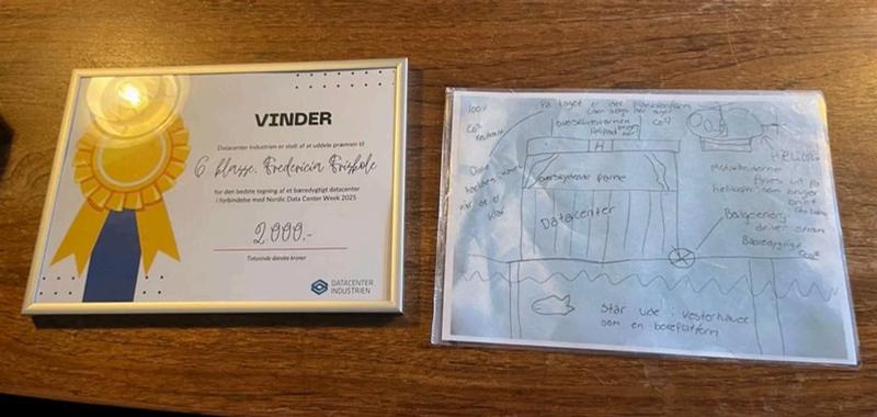 The winning drawing, created by a 6th-grade student at Fredericia Friskole, proposed solutions involving surplus heat reuse, alternative energy sources, and even the placement of a data center out in the North Sea