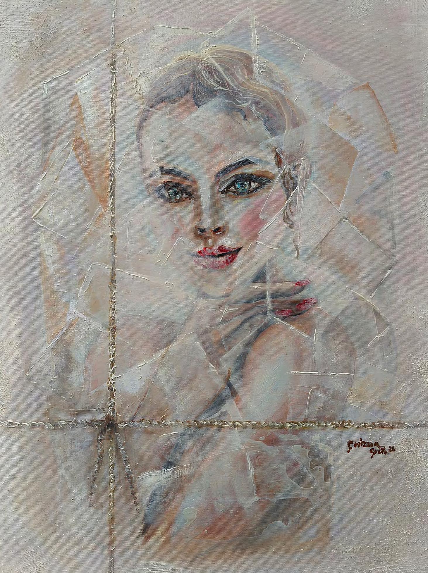 The artwork - Diaphne - from the Greek “transparent” - portrays a young woman whose face, painted with elegant and grounded makeup, maintains through delicate tonalities the ethereal beauty of luminous features. The feminine, in its sacred dimension, is held within the transparency of a subtle yet flexible film that, in its folds, creates segments encircling eternal beauty, protecting its continuity against the wear of time. The canvas, “sealed” by the painted twine, becomes a container in its entirety. A packaging that hides nothing but rather reveals and narrates the visible reality it holds. The unbreakable Aphrodite.