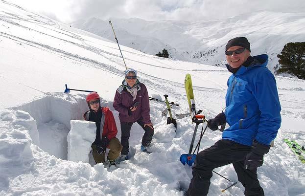 Am zweiten Tag fiel unsere gemeinsame Wahl auf die Elferspitze (2.926 m), südlich des Skigebiets Schönleben und direkt gegenüber unserer gestrigen Abfahrt. Wegen aufkommendem Wind und hereinziehender Wolken beschlossen wir schon auf dem Zwölferkopf, ca. 150 m unterhalb des eigentlichen Ziels, abzufellen. Der gleichmäßig steile Nordhang und der griffige Schnee waren ein Genuss. Auf halber Höhe machten wir einen Verpflegungshalt. Das Wetter überraschte uns nun mit Sonnenschein und Carsten mit dem Vorschlag eines LVS-Trainings und Schneeprofilbeschreibung inkl. Stabilitätstest.