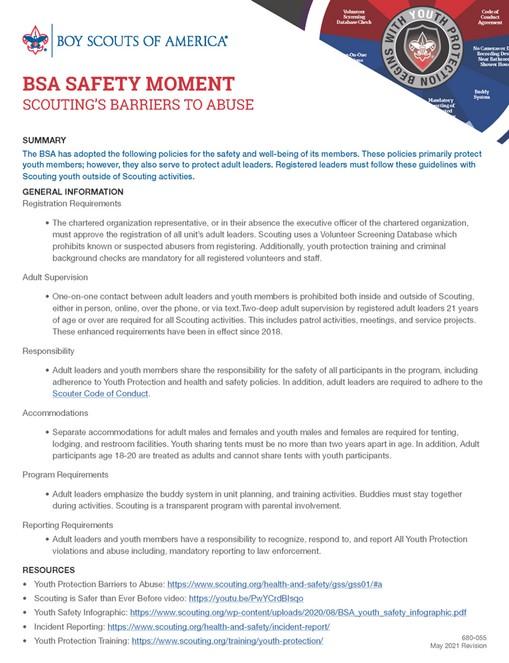 The Boy Scouts of America places the greatest importance on creating the most secure environment possible for our youth members. To maintain such an environment, the BSA developed numerous procedural and leadership selection policies and provides parents and leaders with resources for the Cub Scout, Scouts BSA, and Venturing programs.