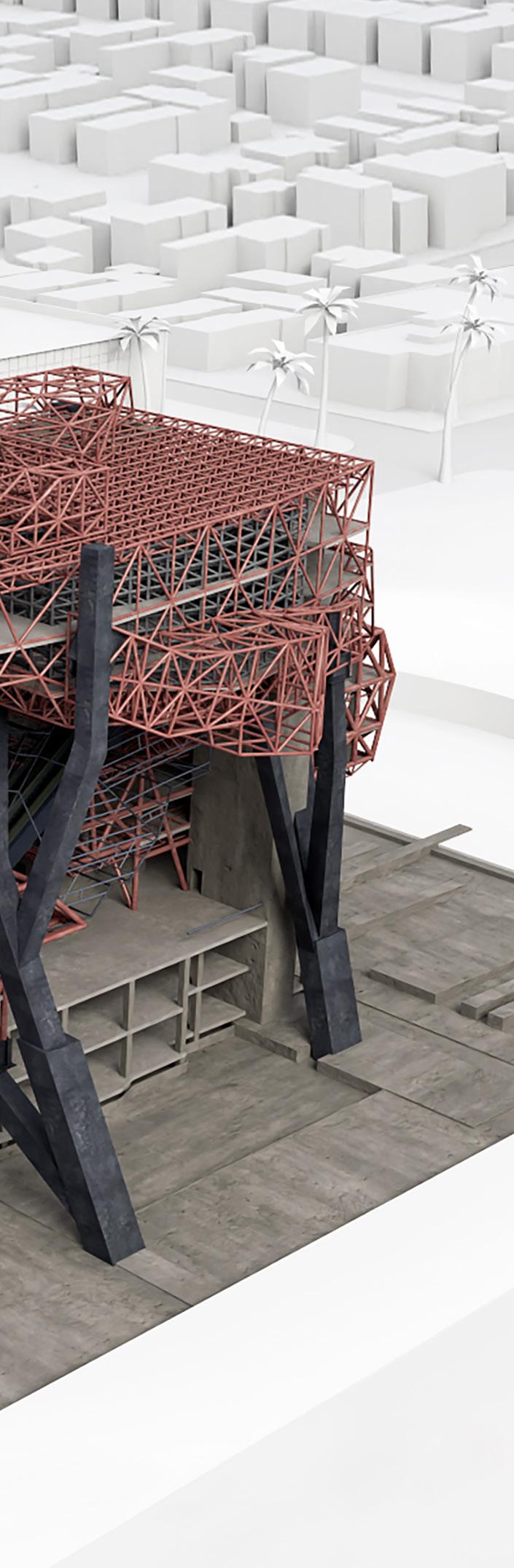 The design is an ensemble of parts that try to piece together, sometimes fitting securely, other times not quite connecting. This creates an unstable composition, ready to fall apart, only held together by branching stilts. Viewing the structure from the exterior site, the collection of parts forms a highly apparent visual of components that are stacked, shifted and sheared in an elevational manner. This draws a clear notion to the public of the crevices and interstitial spaces between the ensemble that can be explored for natural harmony and performance. The components are then enveloped by a glitched tectonic, derived from hacking images of natural landscapes and human machineries to create artificial descendants of their textures. Occupiers enter from underneath the unstable components, in a sort of crawl, under these heavy formations to reach the interior. Occupiers then can climb up the ensemble, reaching the education spaces, music libraries or the interior performance theatres. Escalators, bridges, and elevators work to link these components together.