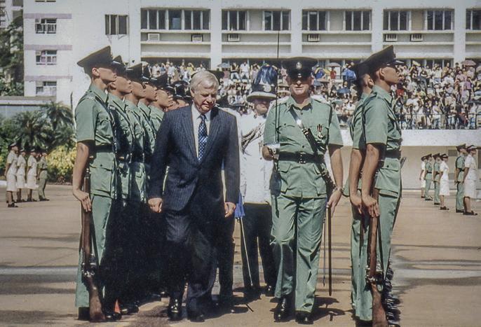 The Hong Kong Governor Chris Patten inspects a guard of honour commanded by Clive Howard