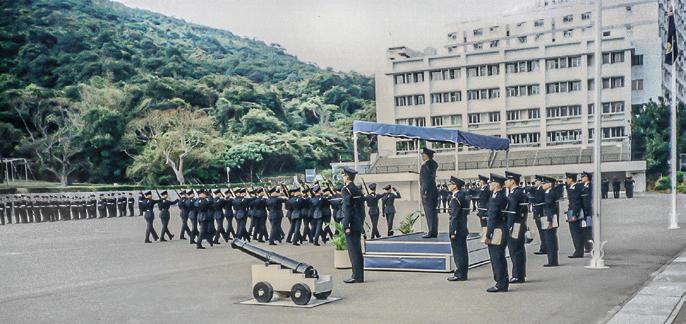 Police recruits march past in a Passing Out Parade at the Police training School at Aberdeen, Hong Kong.