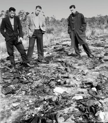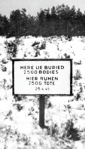 indelibly fixed in the minds of all who had seen the newsreel pictures or photographs of the camp in 1945, which showed hundreds, if not thousands, of naked skeletal figures both dead and dying, lying together in the open and the dead being bulldozed into long deep burial pits, most of them devoid of any means of identity, more reminiscent of cattle being burnt and buried in the foot-and-mouth disease.