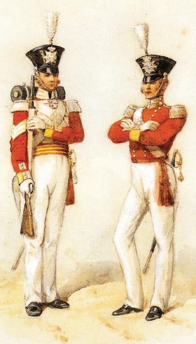 Europe to meet the threat posed by the escape of Napoleon from Elba in 1815, in 1816 it was moved to Quebec where it remained until June 1818, when it moved to Kingston. Then for the next seven years it wandered uneventfully between Quebec, Kingston, Fort George and Montreal, when at last in 1827, after 14 years foreign service, it sailed from Quebec, to join the Irish establishment. It stayed in Ireland until January 1834 when it sailed for the West Indies where it disembarked at St Lucia in the Windward Islands. In 1838 the 76th was sent to Demerara, where yellow fever soon took its toll when its Lieutenant Colonel G H Dansey, 5 other officers and 102 other ranks died. From Demerara it went to Nova Scotia via Barbados and Bermuda and by October 1842 it was back in Ireland. In February 1845 it was stationed in Manchester, where its companies were dispersed between Manchester, Stockport, Wigan and the Isle of Man until in May 1846 it sailed from Liverpool to Glasgow, spending two years in sundry stations between Edinburgh and Aberdeen, These were troubled times, in which, due to the Corn Law riots, troops were scattered throughout the kingdom to meet such a situation and were called out ‘in aid of the civil power’. These distasteful duties did not endear them to the population as a whole and it was not until police forces took them over that the army’s popularity was to improve.
