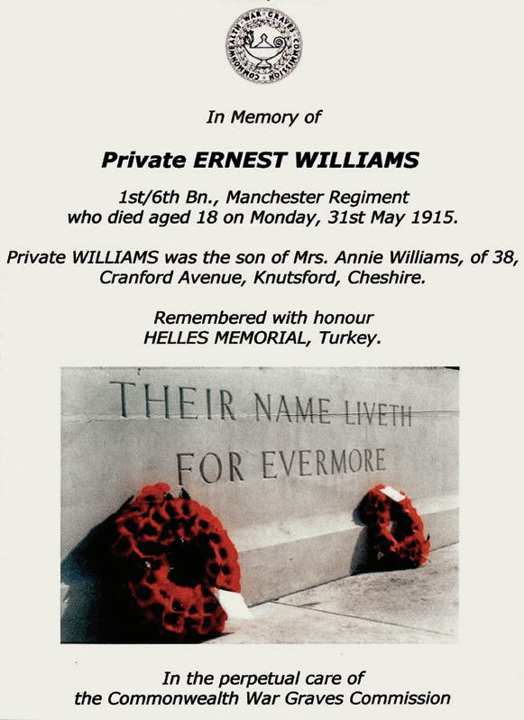Unlike his conscripted cousin, Ernest Williams was fascinated by soldiers as a small boy, becoming an army cadet and then a youthful Volunteer with the 6th Territorial Battalion of the Manchester Regiment. He was killed in action, by machine-gun fire, during an attack on the Turkish trenches during the ill-considered Gallipoli Campaign. He was 18 years of age; his body was never found. Like thousands of other British and Colonial soldiers with no known grave, he is commemorated on the war memorial at Helles, erected in their honour on the Gallipoli Peninsula. These sad losses to the Howard family during the Great World War served to further stimulate my