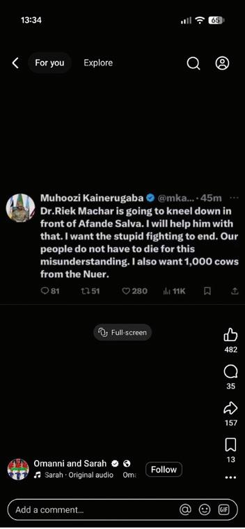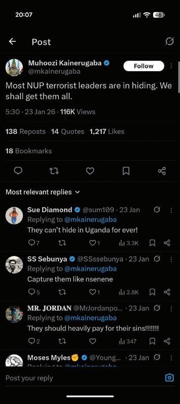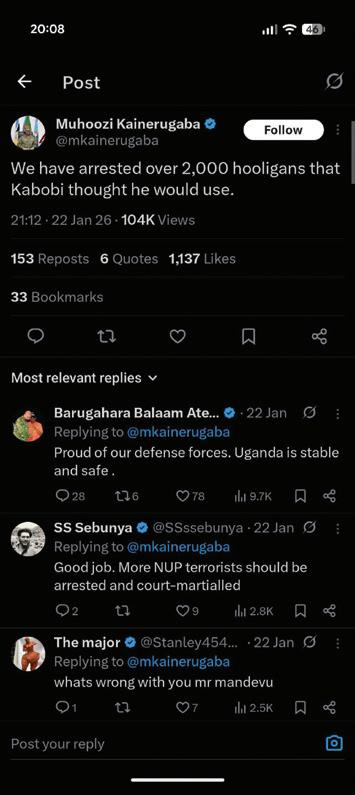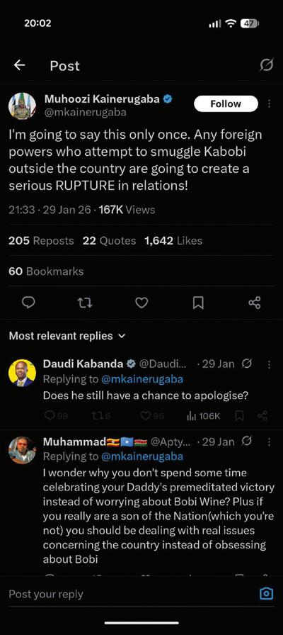 For example, after the January 2026 presidential election, an account associated with Muhoozi Kainerugaba posted a message claiming he was searching for Bobi Wine and had ordered security forces to capture him, dead or alive.