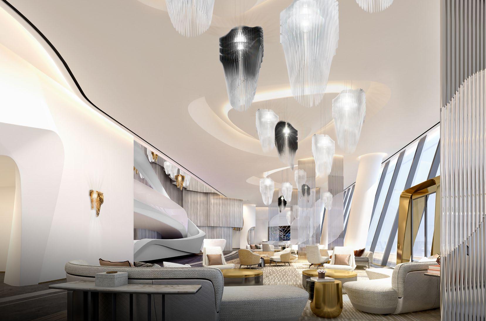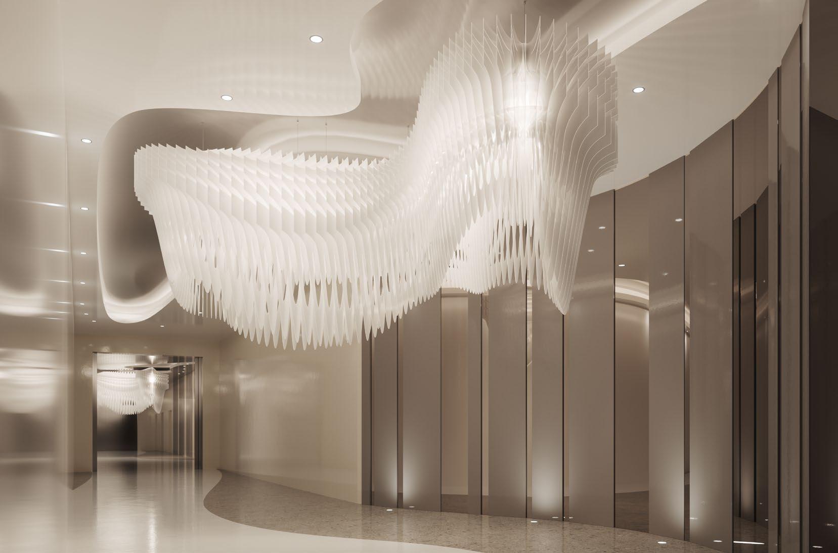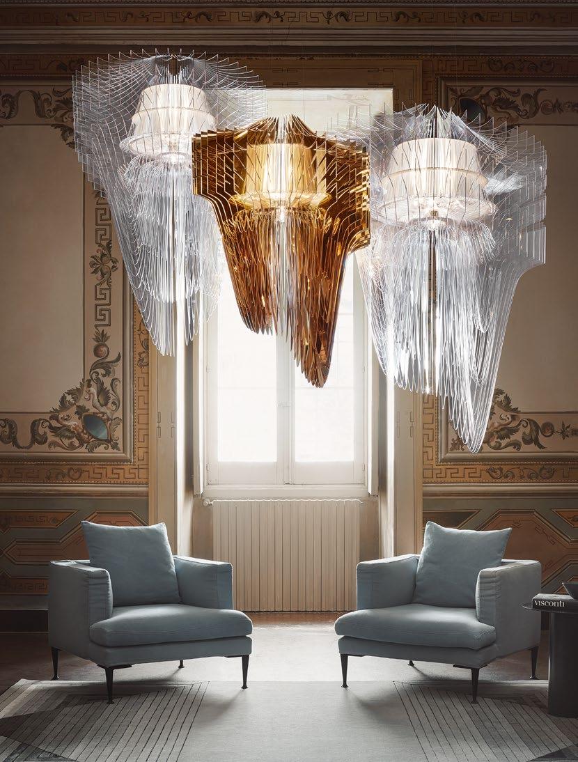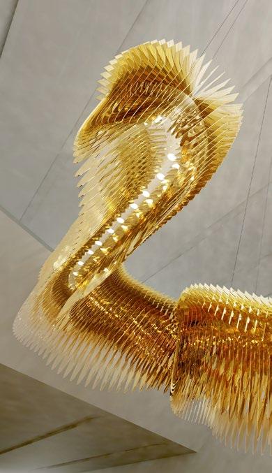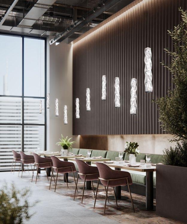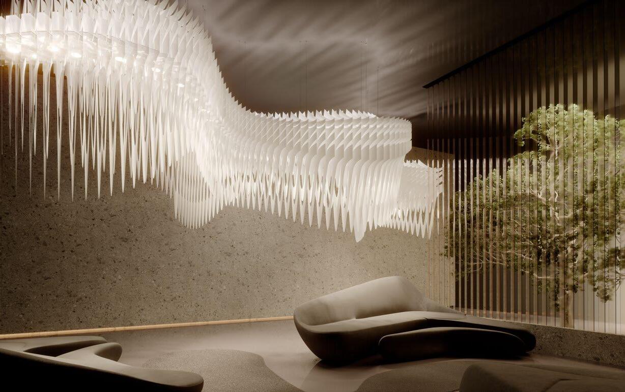 Zaha Hadid and Slamp have collaborated since 2013 to create visionary, fluid and dynamic glowing architecture that brings the architect’s revolutionary and iconic semantics to hospitality interiors. Pictured: Avia Suspension (white and black fade) and Aria Gold Applique.