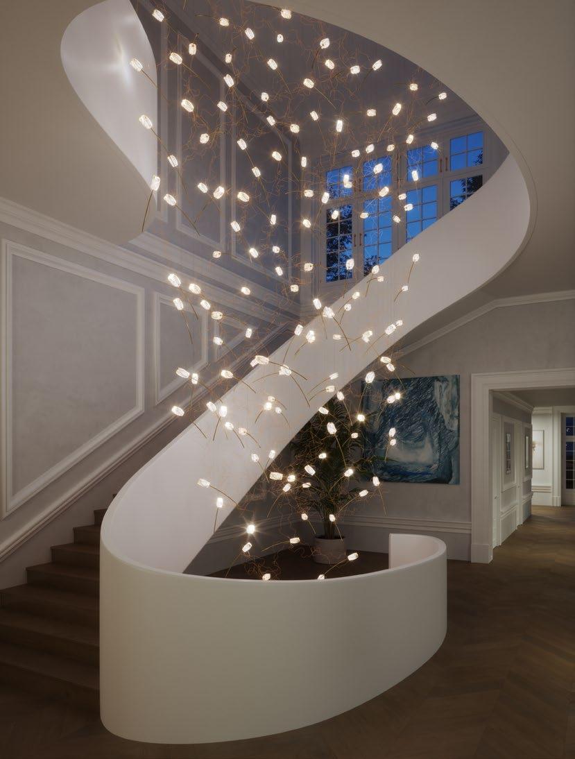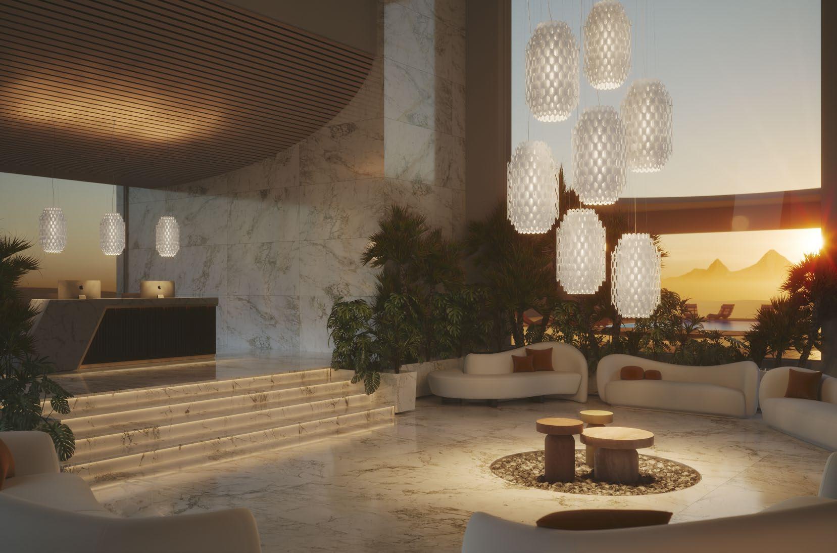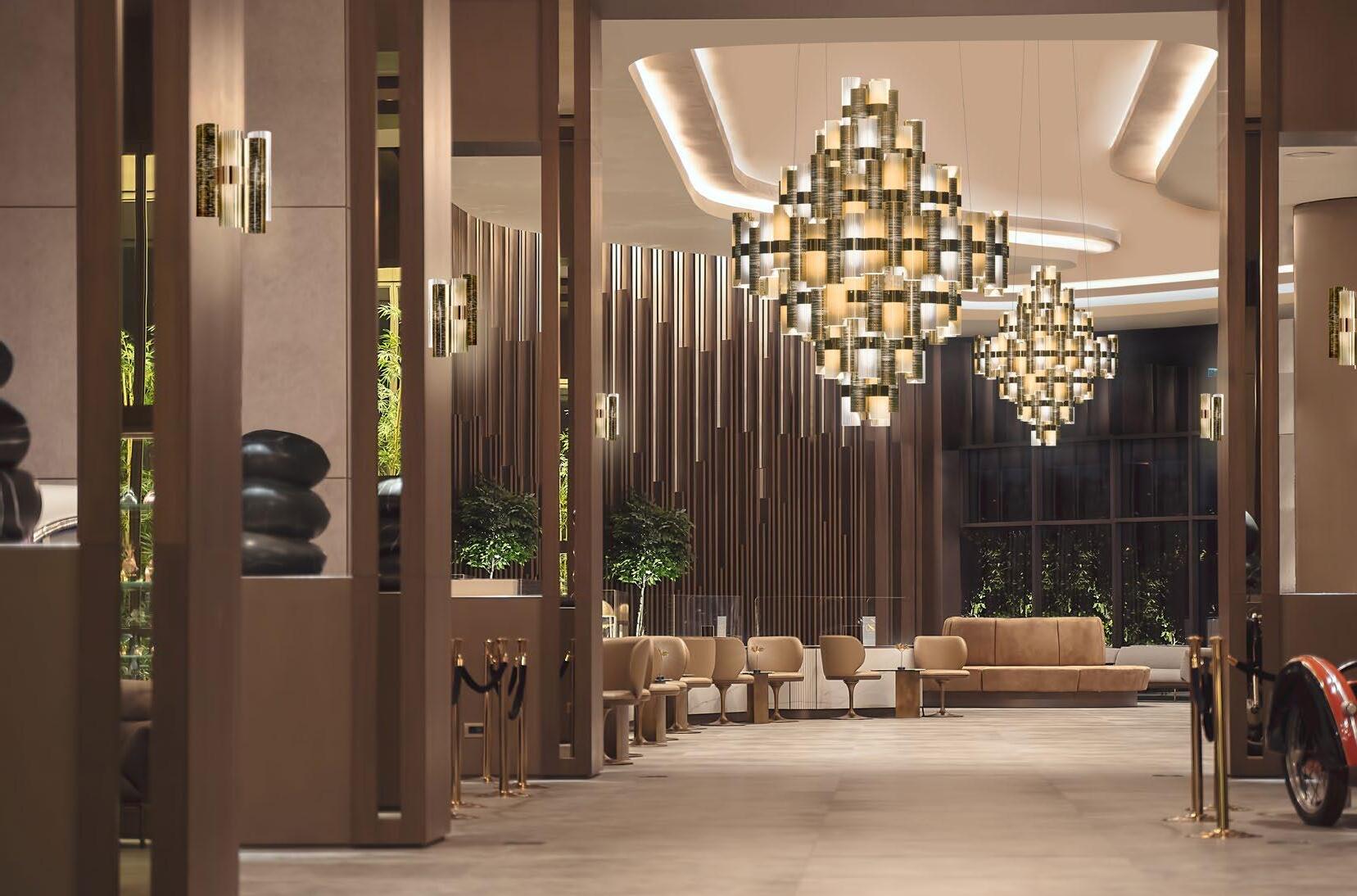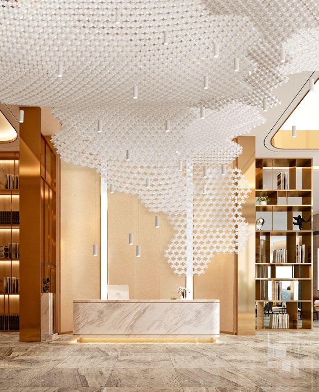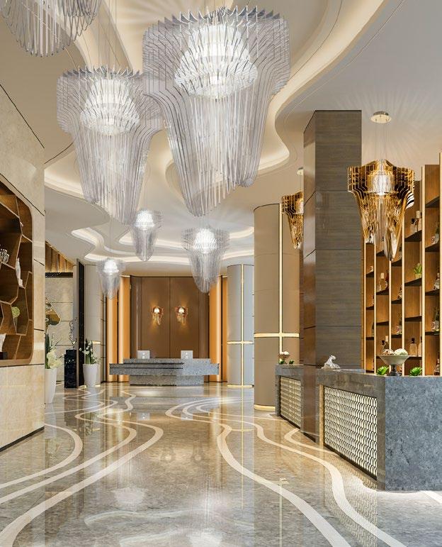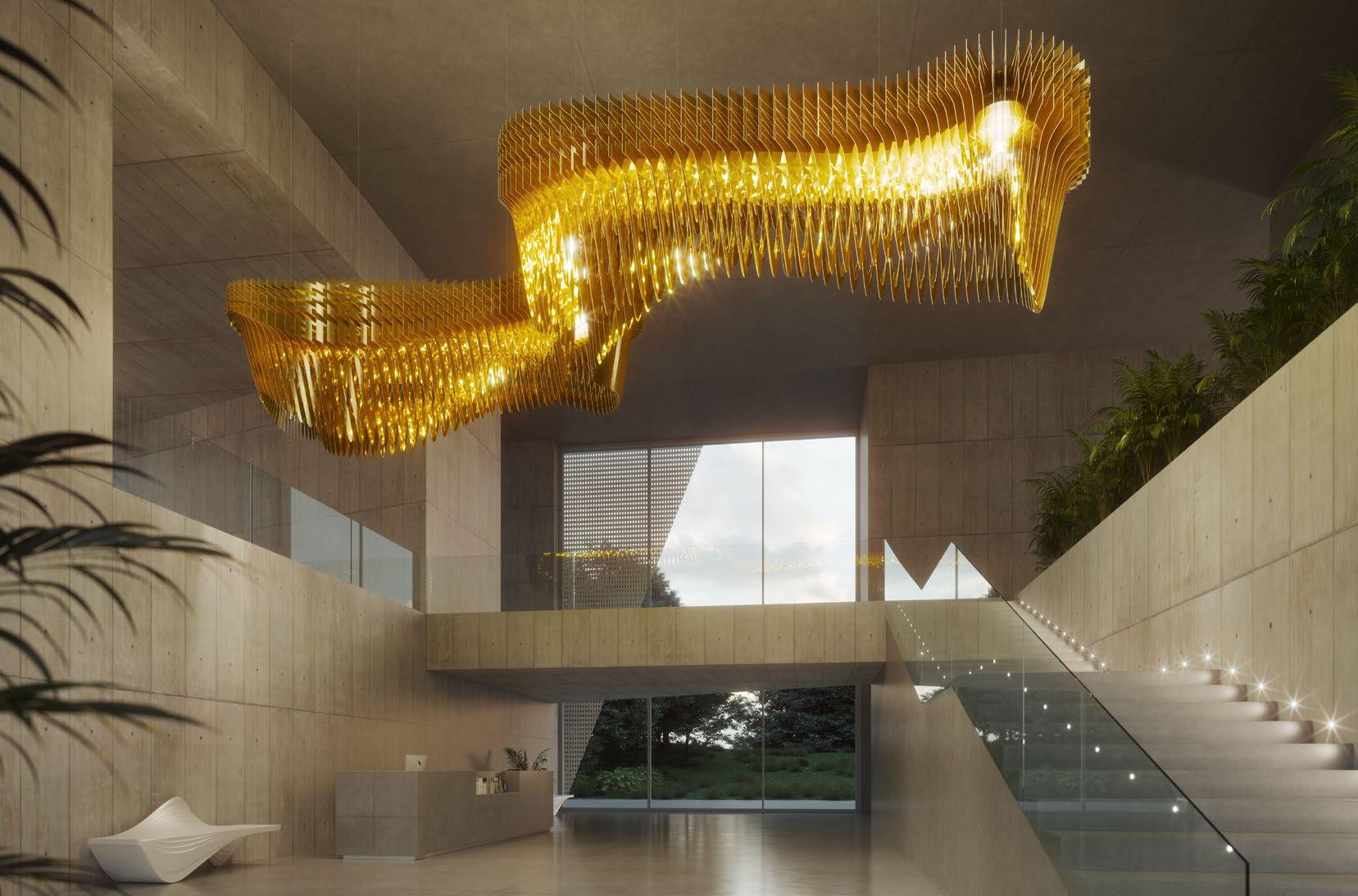 Zaha Hadid and Slamp have collaborated since 2013 to create visionary, fluid and dynamic glowing architecture that brings the architect’s revolutionary and iconic semantics to hospitality interiors. Pictured: Avia Suspension (white and black fade) and Aria Gold Applique.