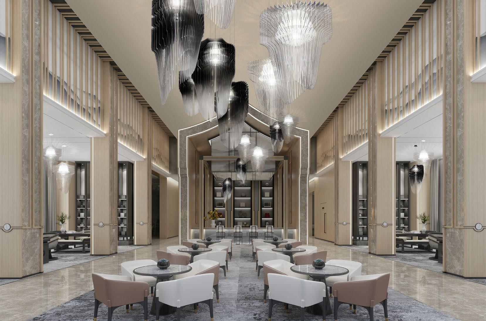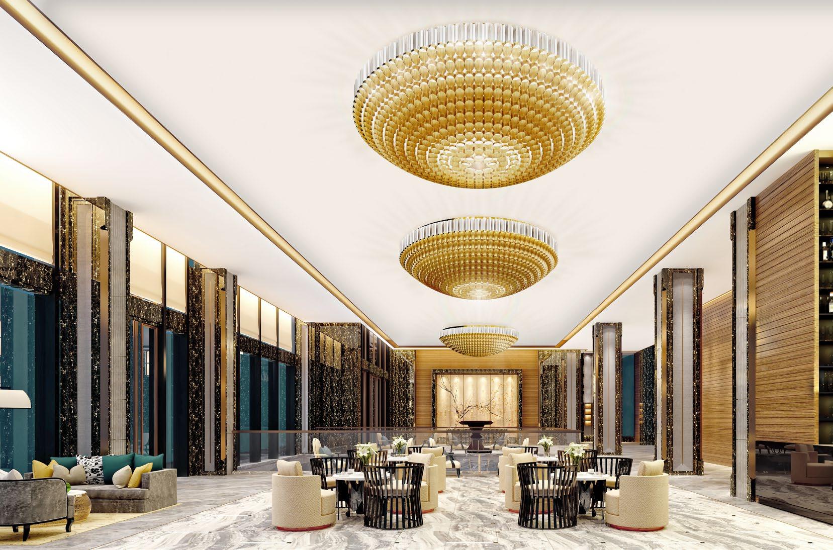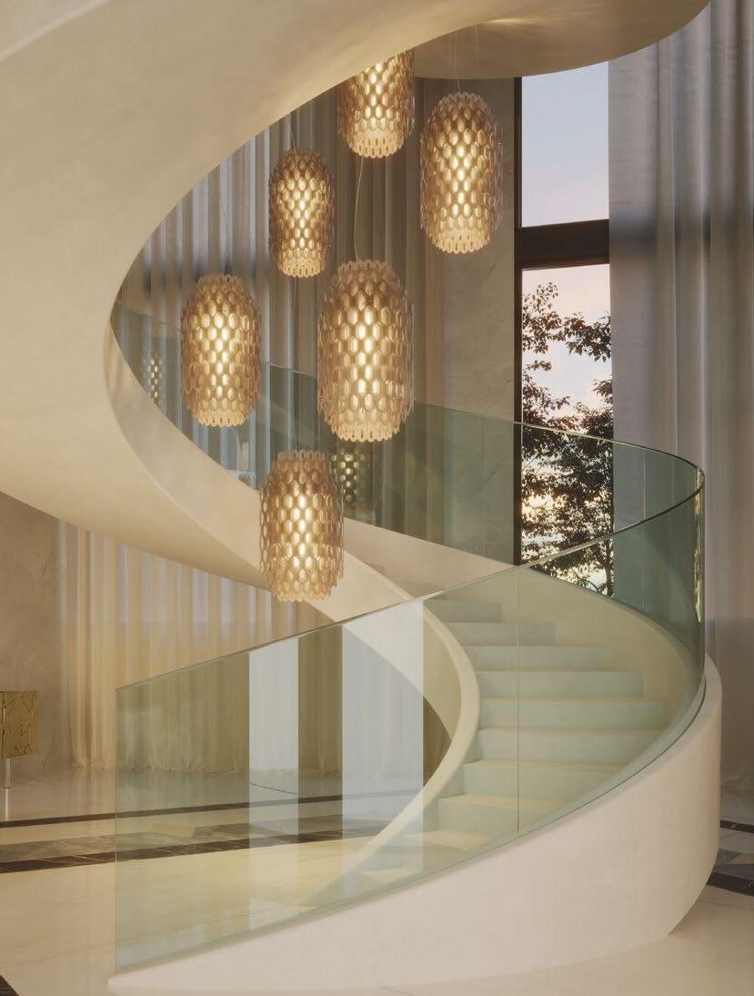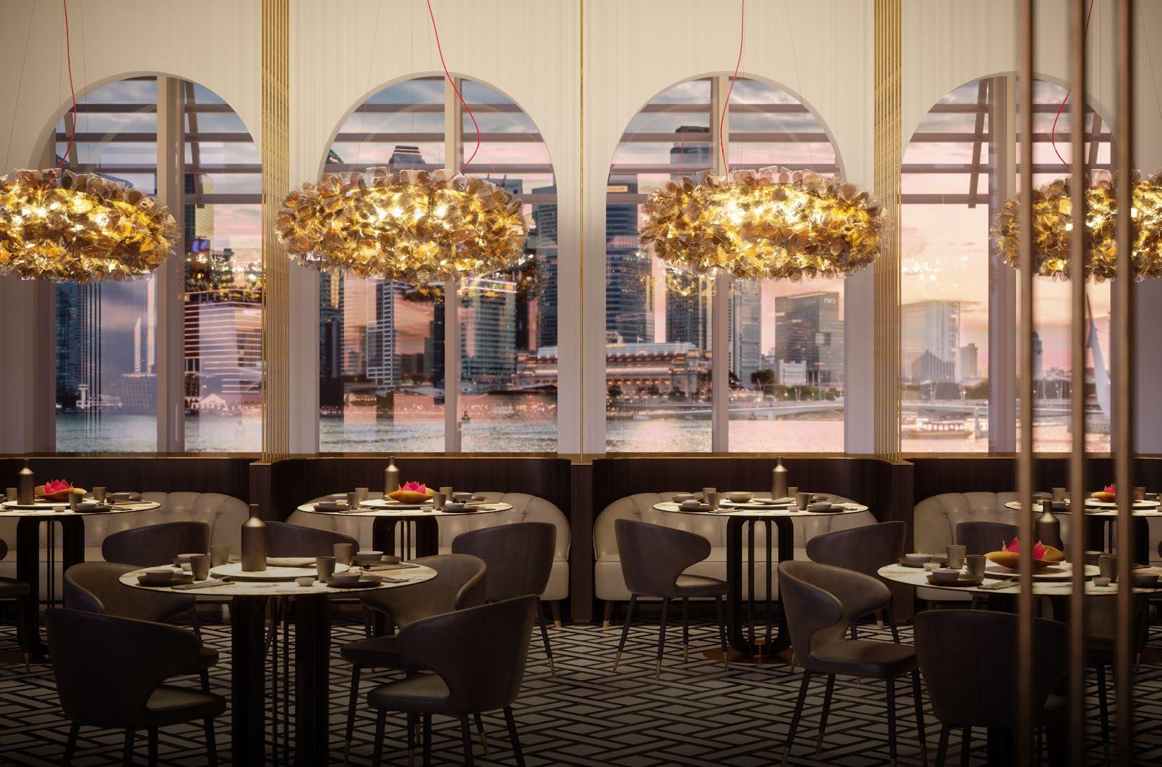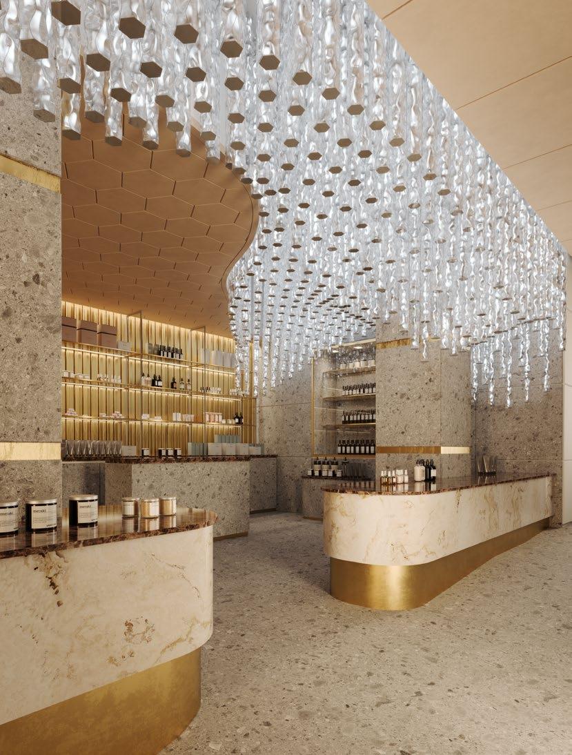 Zaha Hadid and Slamp have collaborated since 2013 to create visionary, fluid and dynamic glowing architecture that brings the architect’s revolutionary and iconic semantics to hospitality interiors. Pictured: Avia Suspension (white and black fade) and Aria Gold Applique.
