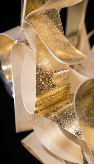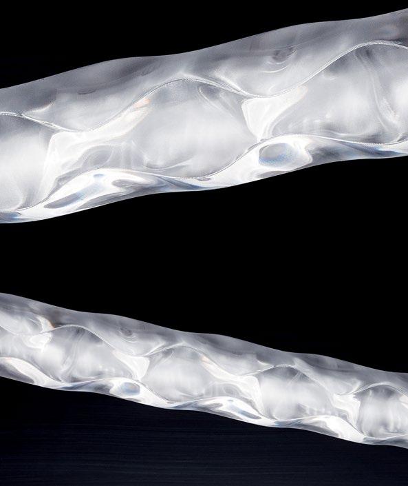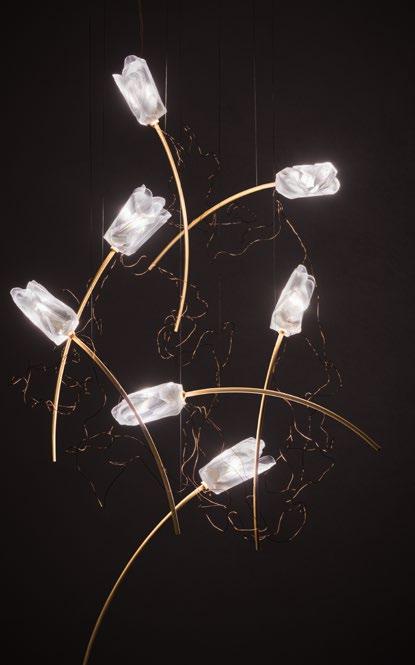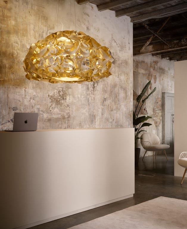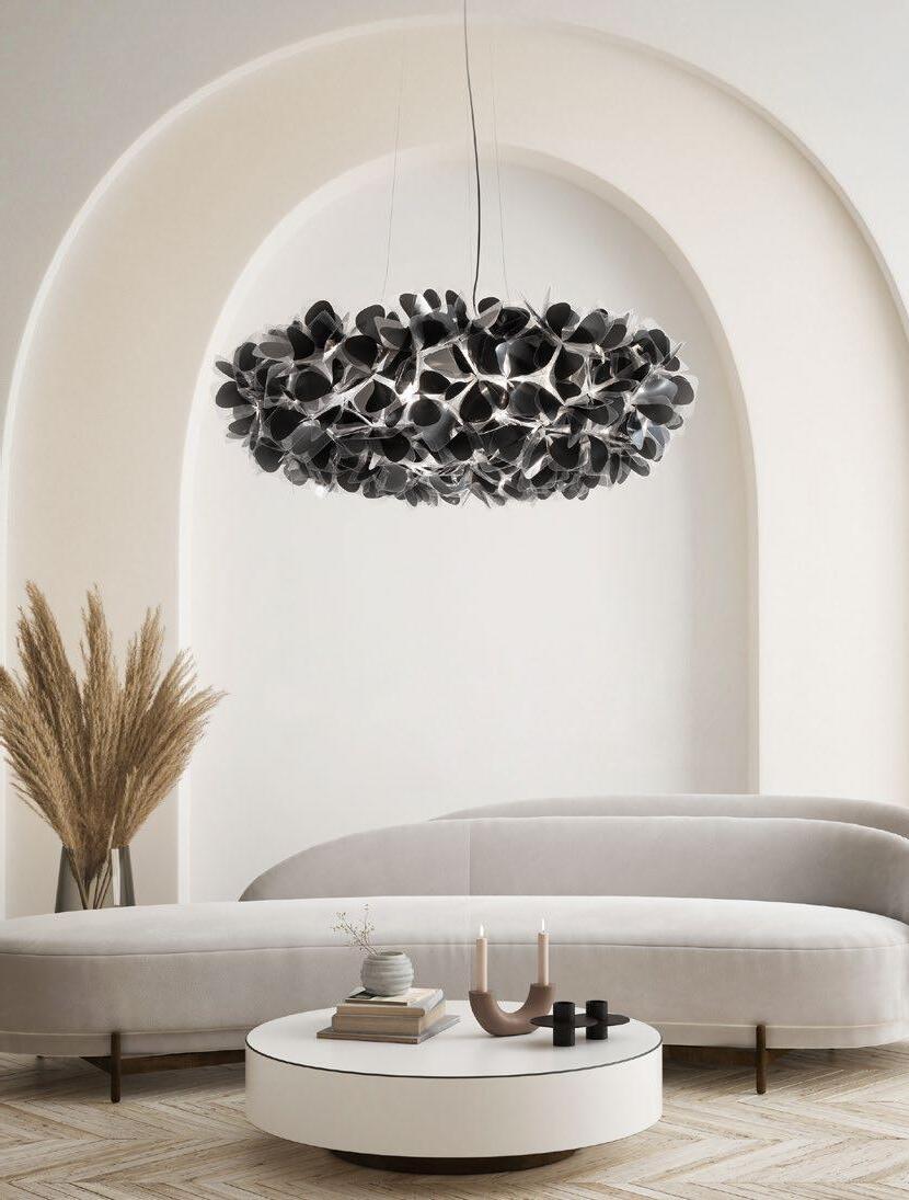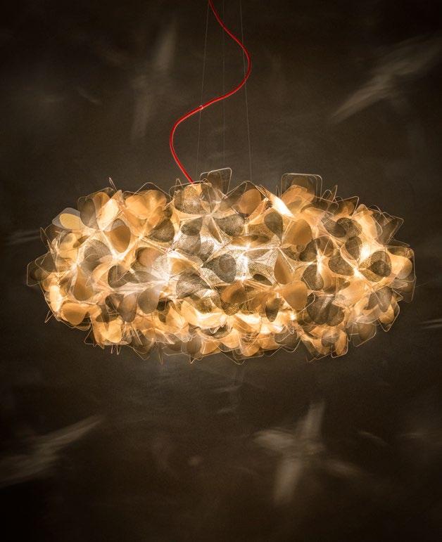 specifically defined only thanks to the true architect of visual and emotional consciousness: illumination. Whether steeped in opulent abundance, an excess of minimalism, linear innovation, or wafting, limitless poetic verse, the following pages trace how Slamp’s endless luminous possibilities stand as the genesis of one’s surroundings, the precise foundation for what will be conceived, and what is perceived. The company’s take on avant-garde, versatile modular options and standalone pieces to be combined at will moves from shapeshifting expansive elements that beg for bespoke installations to stark architectural sculptures that make up the lustrous bones of a place, when singular or elegantly combined. This book is an invitation, a peek into the potential, the aesthetically unbound, the never-imagined power of light.