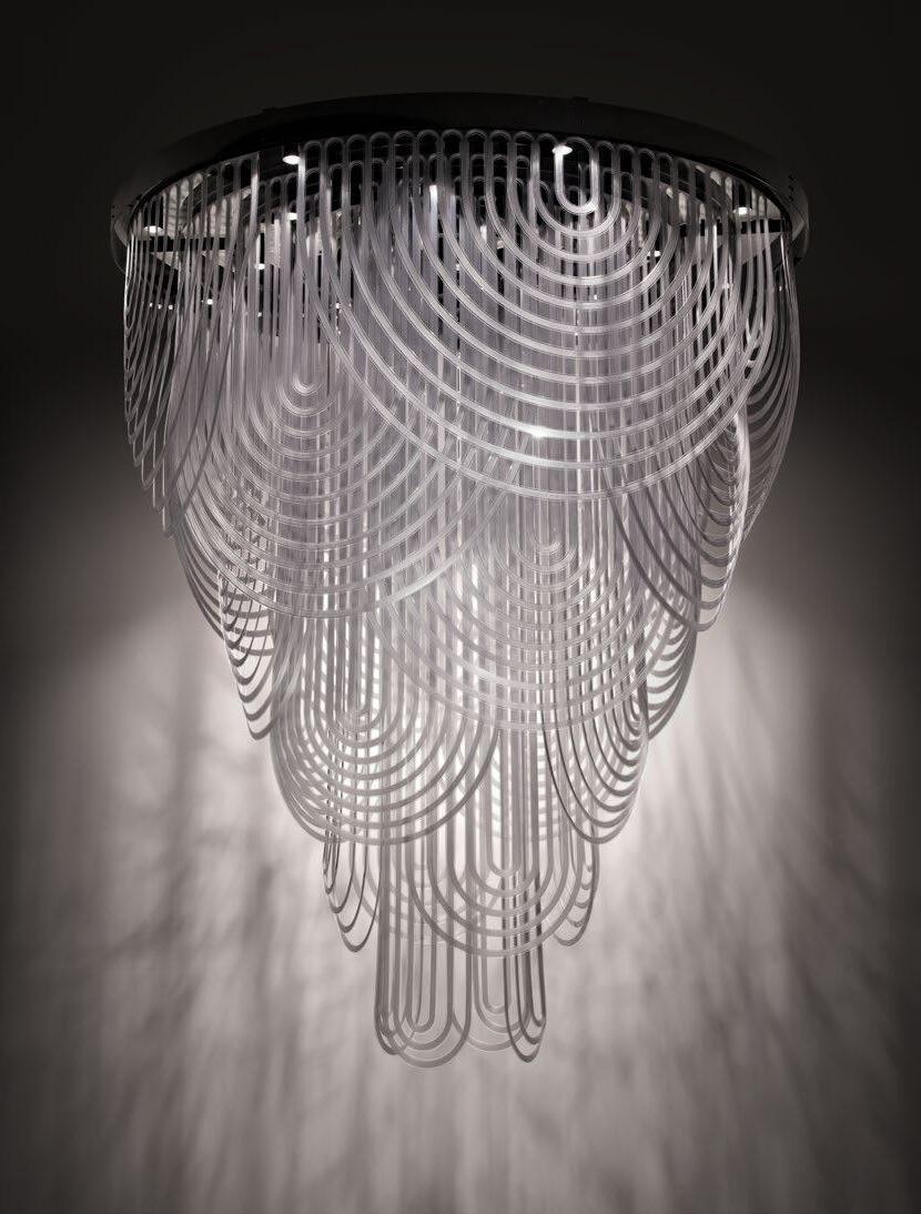 The illuminated modular system sinuously undulates throughout a space with diverse polycarbonate layers that in the lamp’s highest points, reach 2 meters of visionary fluidity.