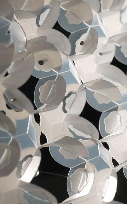 Nuvem features one sqm. modules that can be infinitely combined; each includes a bidirectional spotlight. This page: 3 overlapping bands of Nuvem create a composition of 115 modules. Additional spotlights can be purchased to amplify illumination. Previous page: 84 modules with 16 bidirectional spotlights.