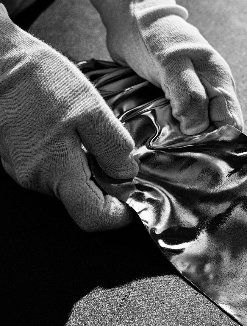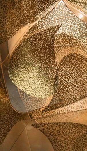 Cristalflex® petals are covered in gold foil using a cold-coating process, and the crackled texture lets light shine through, an effect that other types of paint or printing cannot replicate.
