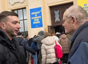Det er ikke let at komme ind i og rejse gennem Ukraine: 3 dage fra Storbritannien til den Ukrainske front og 4 dage for at være sikker på ikke at gå glip af vores fly hjem til jul. Vi ankom fredag middag til fæstningsbyen Kharkiv – til lyd af luftalarmen. Det er normalt. Vi forlod Kharkiv mandag eftermiddag, igen til en luftalarm. Med bombede boliger og fabrikker er Kharkiv fortsat en travl by, fuldt levende. Slogans på væggene erklærer: ”Vær modige som Ukraine”, ”Mod er stærkere end bomber” og ”Vi er anderledes, vi er Kharkiv-folk”.