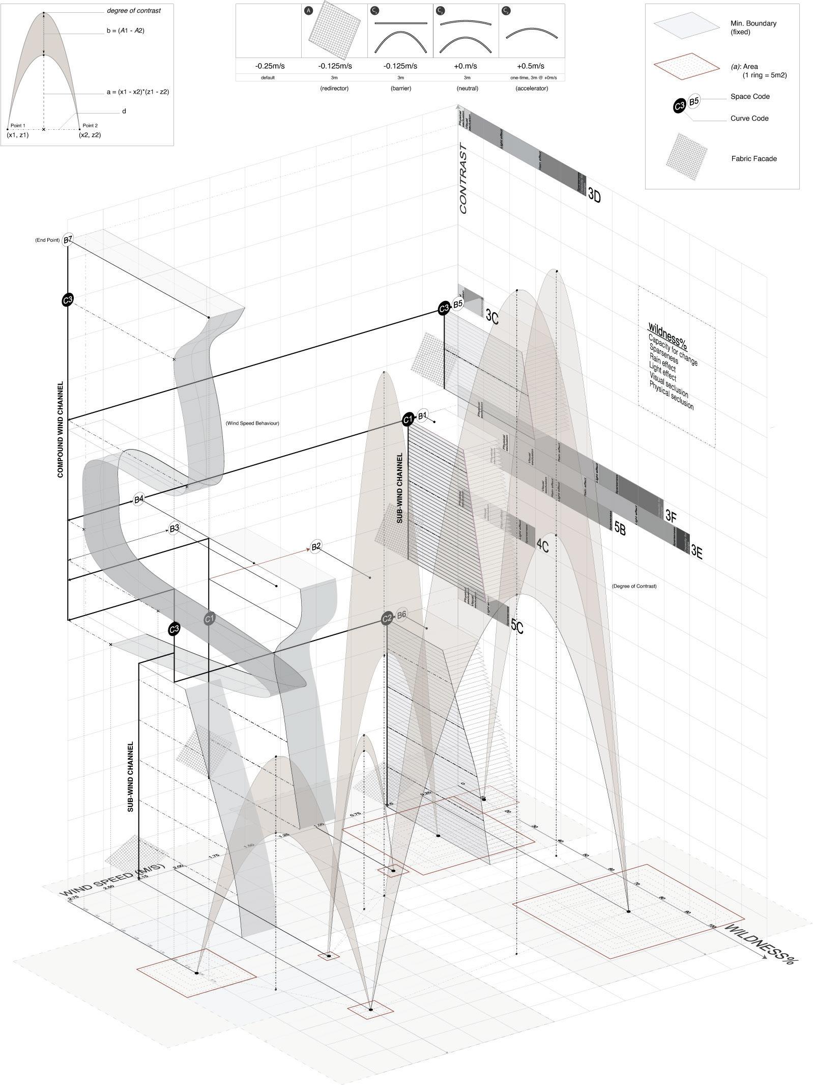 Following the 2D mapping notation, syntaxes were ascribed a set of actions (twist, crimp, stretch, bend) and performed onto a single sheet of tensile material to explore naturally occuring computational design which acted in fields and clusters rather than conventional cartesian coordinates. By remaining faithful to this process of translating data to performable action, an expression of data was used in creating a complex form - in other words, manual computational design. The end result was hybridly replicated using modern computational softwares, as well as in a handdrawn method.