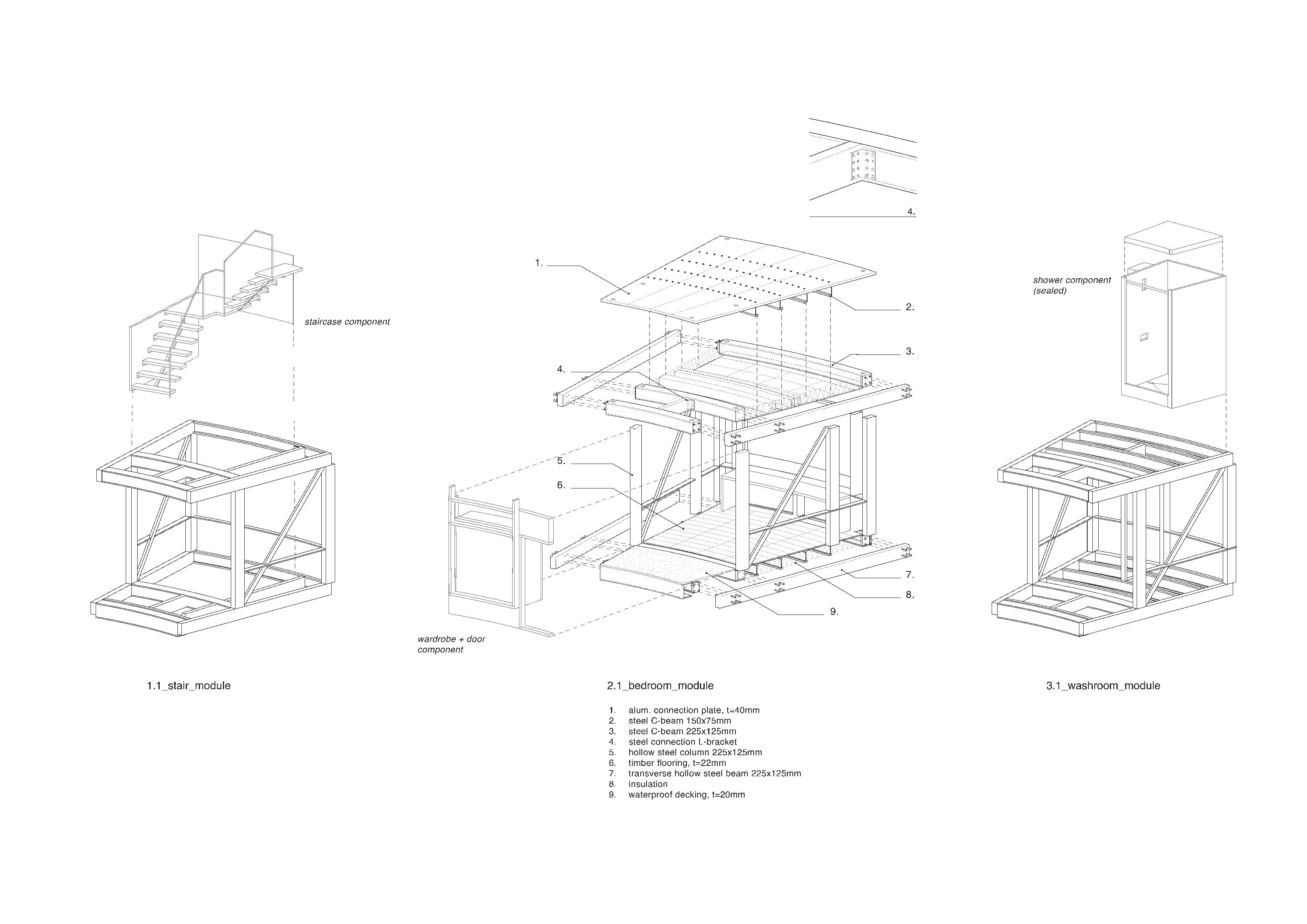 The structural systems present in the aggregation is a hybrid: utilising a steel brace frame for the central core, and a semi-independent box culvert structure for the periphery circulation spaces. In doing so, this allowed for the creation of three realms of spatial experience within the structure: Isolated – Semi-Exposed – and Exposed whether it be within the staircase structures, or through the aggregation of units itself.