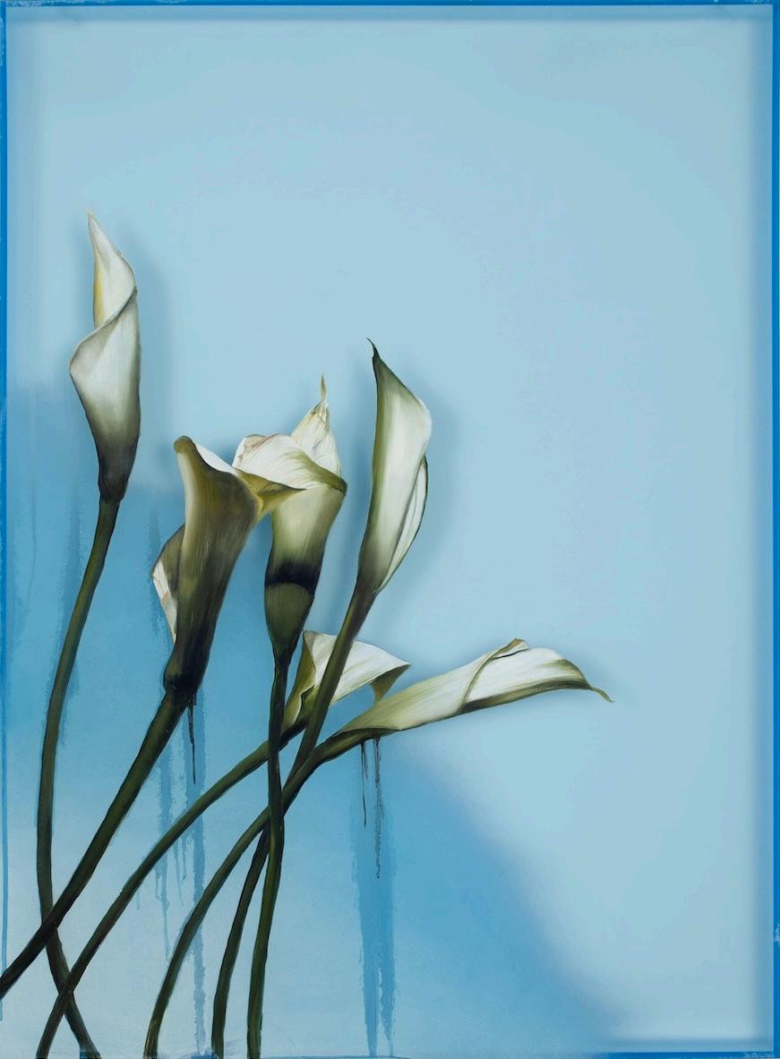 18)CalaLiliesonBlue,2025 oilonfrostedacrylic32x2350in