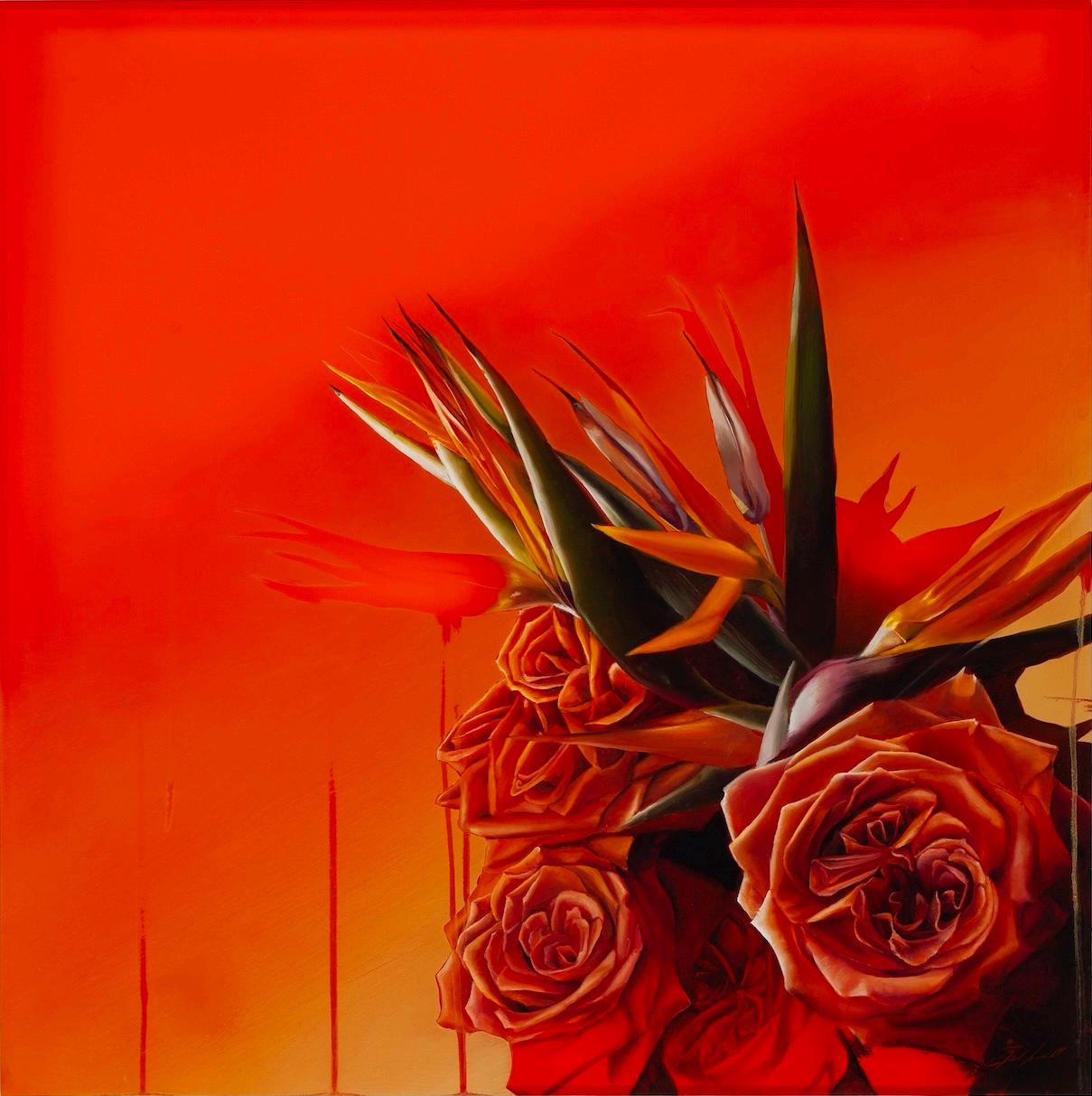 11)BirdsofParadiseandRoseson Orange,2025,oilonfrostedacrylic,24x 24in