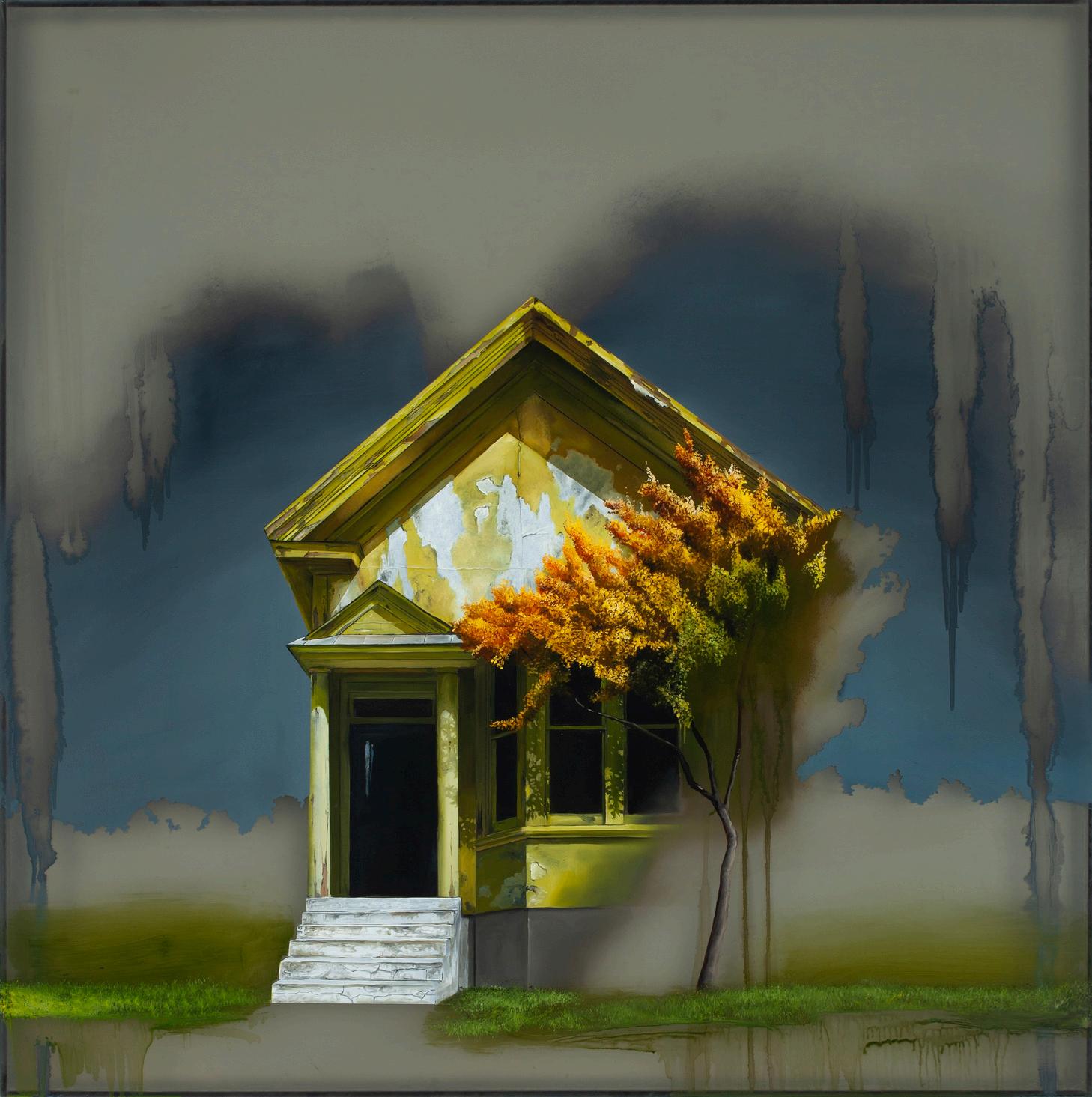 13)YellowHouseYellowTreeonGrey, 2025,oilonfrostedacrylic,36x36in