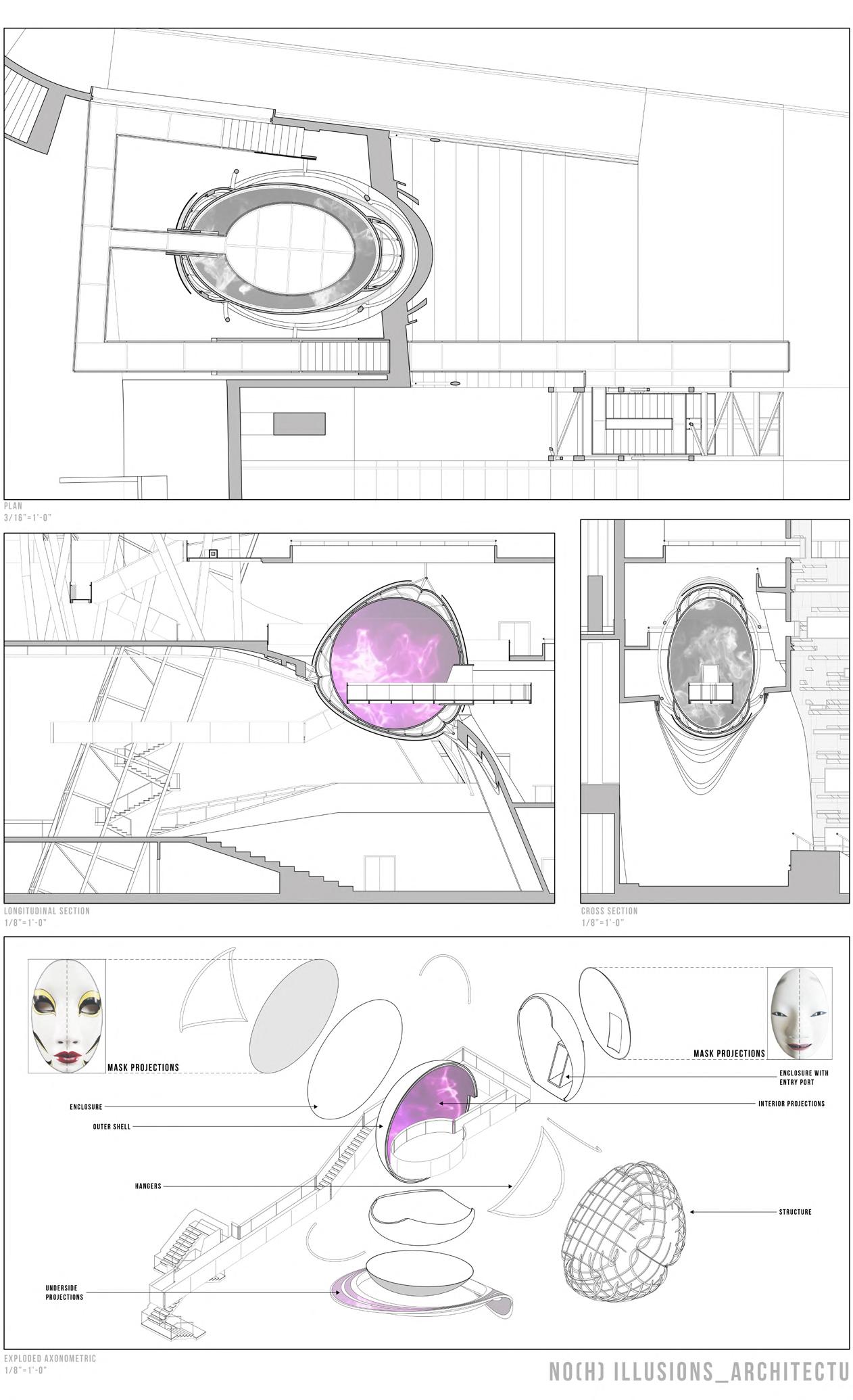 Within the proposal comprises of two installation pieces expressing their own personal narratives. Both encapsulated within the concourse, the installations serve to provide diverse perceptions of space creating two new dialogues for performance shaping the project. The first installation, No[h] Illusions, is specifically set in-between the cantilever and concourse where the piece is experienced both on its exterior and interior. Using the concept of masks from a major form of Japanese musical drama called Noh, and the concept of illusion, the installation develops a narrative expressing hidden moments awaiting to be exposed like how emotions are depicted on masked figures. The second installation, Azure Pandora, is specifically set within the apex of the concourse. Inspired by the concept of bioluminescence derived from the film called Avatar, the installation encompasses a forest of azure-infused light tubes with various stairs and platforms. In effect, the installation exposes the viewer to a world of merging colors unlocking the glow of Pandora.