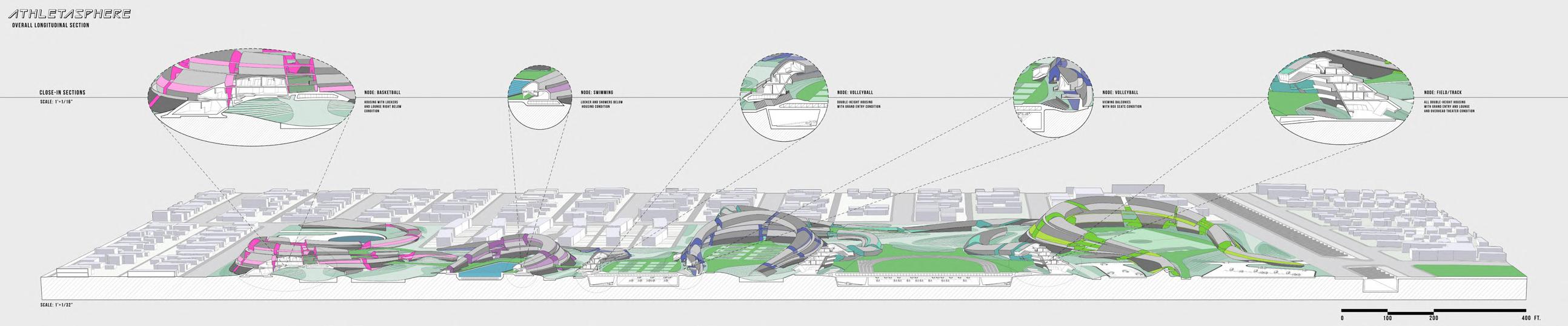 Synopsis: For decades, public housing has long been the tumor of modern metropolis. Commonly known as “Projects”, the term originally used to describe the vision of urban improvement by city planners, has instead become synonymous with inner-city blight, crime, gun violence, illegal drug trade and poor living condition. In addition, the dilapidated conditions and meager funding in projects like Jordan Downs and Nickerson Garden has made Los Angeles a host city for the worst housing projects constructed since World War II. As a result, the communities living within the projects are underprivileged, neglected and in dire need for change. Fortunately, Los Angeles 2024 Olympic bid provides the opportunity and funding that makes the transformation plausible. Taking advantage of the Olympic vision and legacy, we propose a new typology of living by synthesizing housing and sports complex that replace the existing housing projects. In doing so, the Athleta-Project hiders criminal activities through open and decentralized planning, as well as activating the local underdeveloped communities through positive impact of sports. Understanding that Los Angeles function as a city of stages hosting performances, awards and sports, the Athleta-Project will serve as a local stage for the Olympic city, one that constantly enacted by the residence and observed by the public. Using the idea of staging, the housing and sports complex will perform symbiotically that permanently reform the contemporary housing projects.