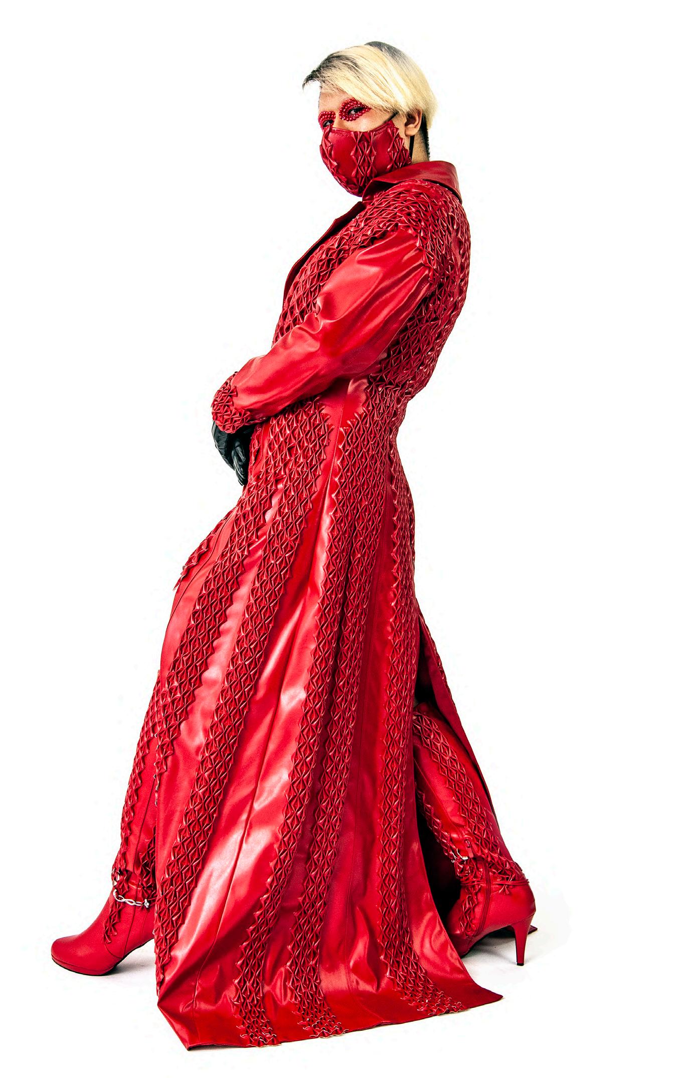 AKA: Also known as red, AKA is inspired by the love for my Japanese heritage. Red represents strong emotions and desires through energy, vitality, and heat. By combining the concept of a trench coat and a dress, the design developed into a unified garment immersed in red. The ensemble is paired with a matching face mask, flower bouquet, and high heel boots. These pieces together form a cohesive power and vibrancy that can only be explained with bold, yet simple AKA.