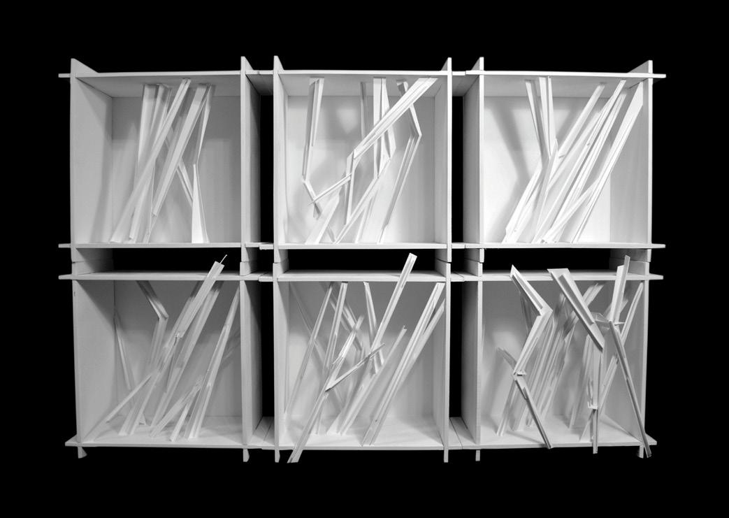 B. Presentation Model with Wall Detached | Basswood, museum board, bristol, paint, & frosted plexi