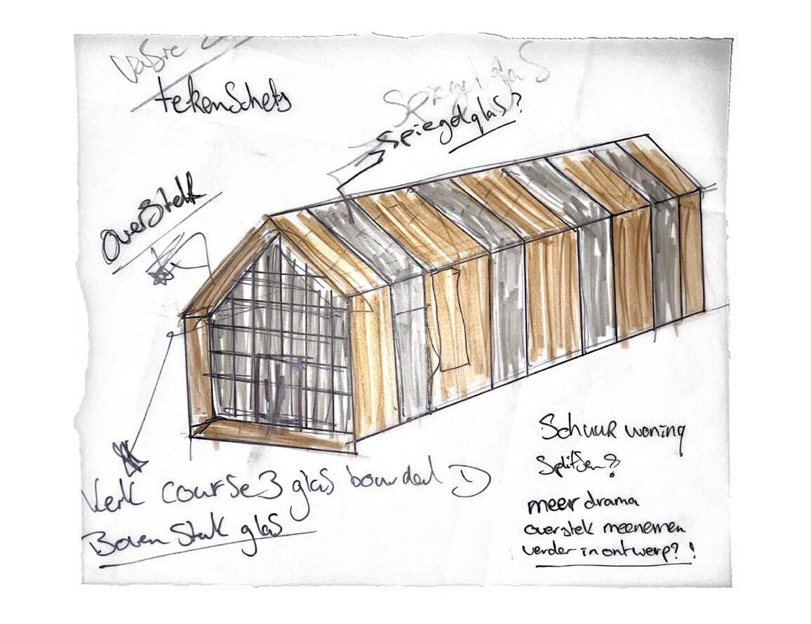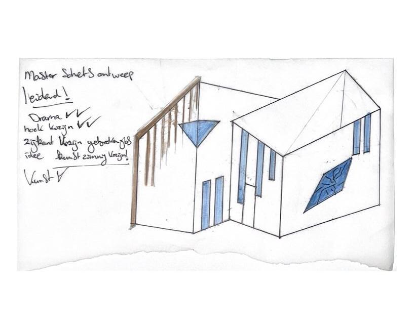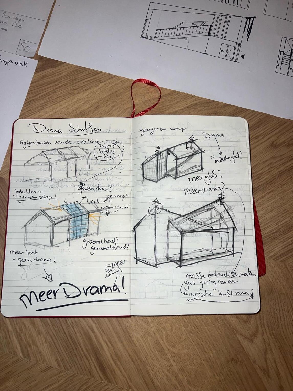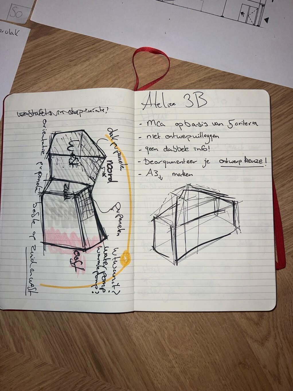 "Gedurende de komende weken ben ik druk bezig geweest met het schetsen van een woning die zowel voldoet aan alle eisen als een toegevoegde waarde geeft aan de wijk Presikhaaf III. De voorbijgaande weken heb ik van mijn rode notitieblok een soort schets dagboek gemaakt. De uitdaging? Alle schetsontwerpen die als het waren uit mij kwamen stromen tot op een punt brengen. In gesprek gaande met Suzanne Nagtegaal kreeg ik een zin als terugkoppeling.