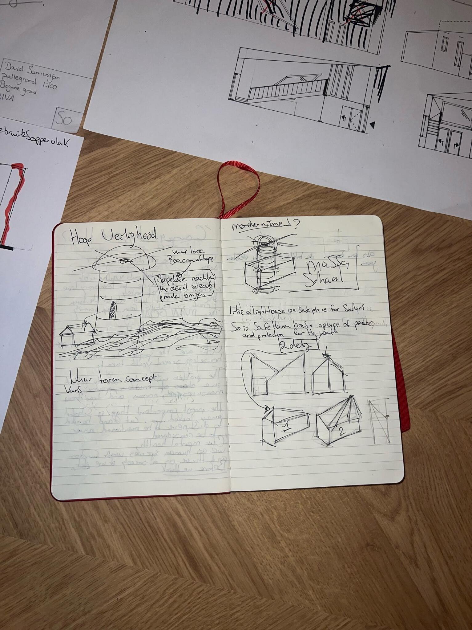 "In het weven van architectonische verhalen is de procesmap een beduimelde atlas, leidend door de weelderige pagina's van ruwe schetsen naar de uitgewerkte pracht van een definitief ontwerp. Te midden van deze cartografie schittert de vuurtorenmetafoor als een symbool van 'Safe Haven House' voor de kwetsbare jonge zielen van Presikhaaf III.