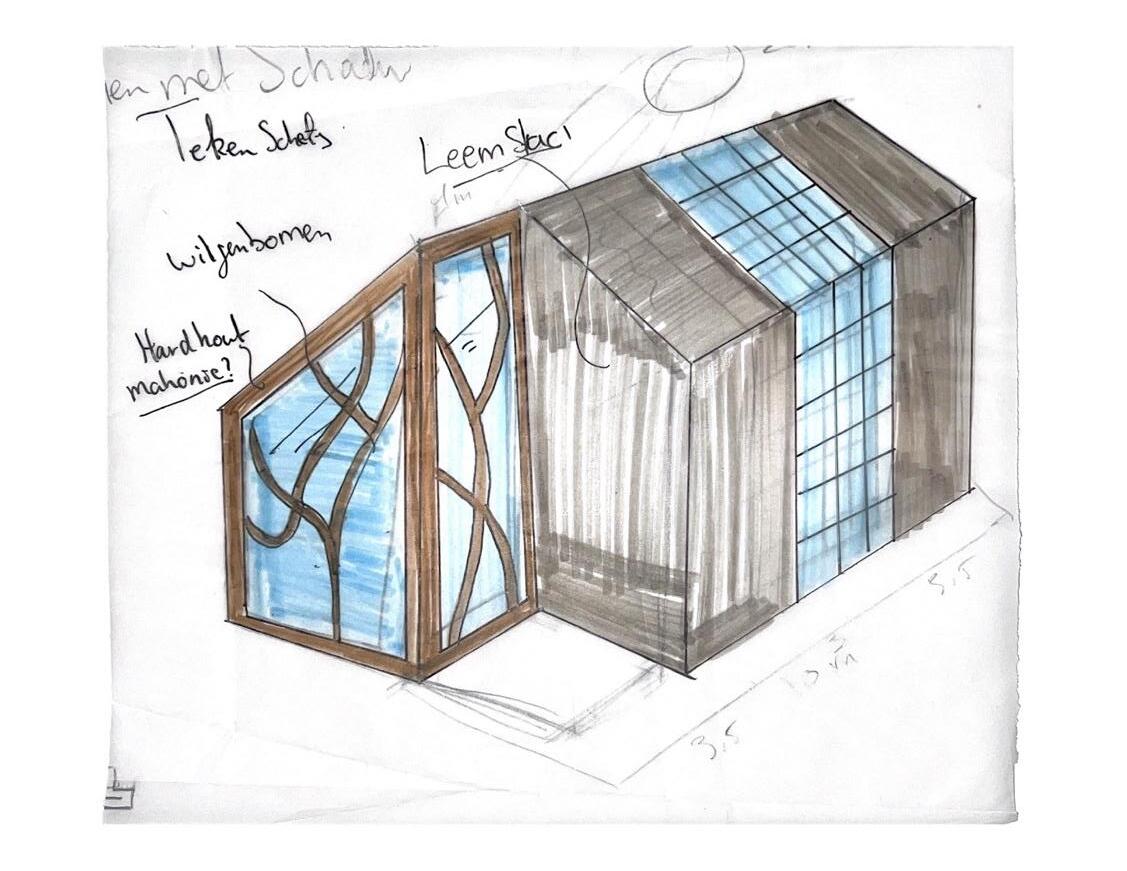 "Voordat ik ben gestart met ontwerpen heb ik ervoor gezorgd om de locatie grondig te onderzoeken. Uit mijn “mini” onderzoeken die ik ter plaatse heb uit gevoerd kwamen interessante punten naar boven. Zoals de wilgenbomen die op de kavel bevinden, het hondenpark die tegen over de kavel zit en de beukenbomen. Deze bevindingen zijn meegenomen met het ontwerp om zo een samenhang te creëren met de omgeving.