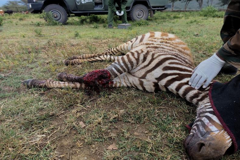 The Lake Naivasha area and the Central Rift Conservation Area in general received sporadic rain over the reporting period. Out of the 14 cases attended to, six involved snare related injuries. Two zebras, a buffalo and a porcupine were successfully treated however an eland and a hyena succumbed to the damage caused by the snares. The Unit also assisted with two relocations to mitigate human wildlife conflict, the first was of 11 waterbucks from Kingfisher Farm to the riparian area of Lake Naivasha as they had on various dates attacked farm workers and were known to raid crops in the farm. The second was the emergency capture and translocation of 6 hippopotamuses from the Naivasha Sewage Plant filtration ponds to Tundra Conservancy.