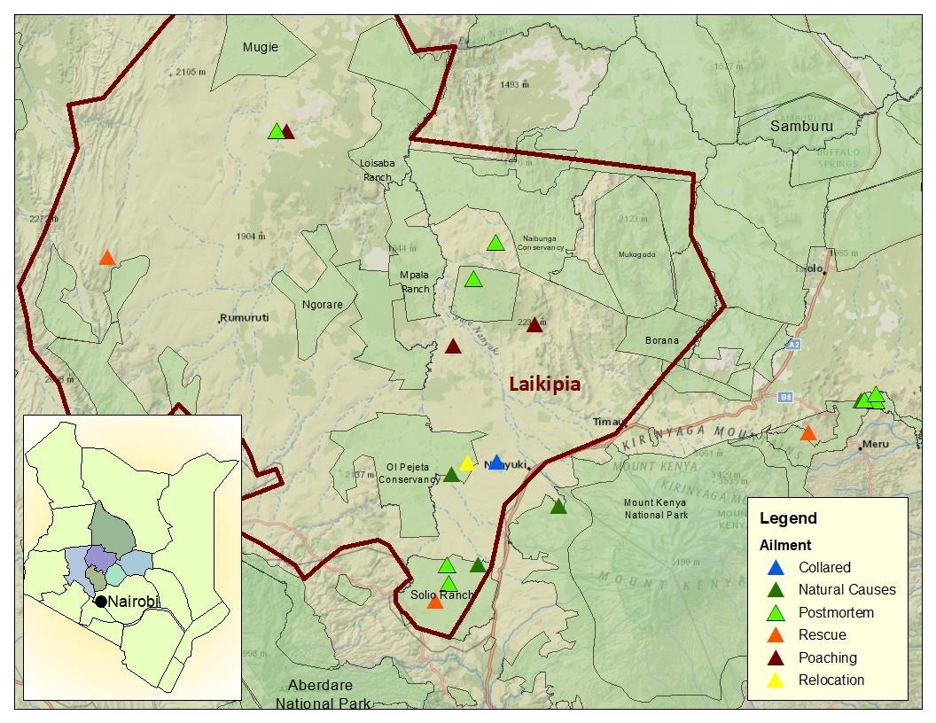 The rainfall in July was a welcome relief in the Mt. Kenya and Laikipia ecosystem, the subsequent abundance of forage and water for wildlife and livestock resulted in fewer human – wildlife conflict cases and a reduction in the clinical case load. The Mt. Kenya and Laikipia region experienced light showers in September which provided some respite from the prevailing dry conditions, although the rain was insufficient. There were only 6 poaching cases, though sadly there were 3 deaths including a speared eland, snared zebra and an elephant with a bullet wound.